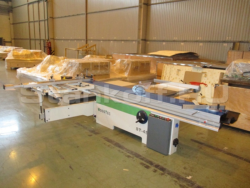Станок дополнительно оснащен эксцентриковым прижимом для надежной фиксации заготовки. Легко позиционируется и крепится на двухроликовой каретке.| Техническая характеристика форматно-раскроечного станка WoodTec ST 45 | ||