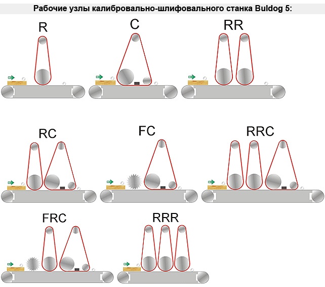 - 3 типа рабочих агрегатов: калибровальный (R), шлифовальный (С) и фрезерно-строгальный (F). Контактный калибровальный вал тип R достаточного диаметра для большого съема материала за один проход. Комбинированный шлифовальный узел С – контактный обрезиненный вал с утюжком – комбинация для удаления волн от шлифовальной ленты. Строгально-фрезерный вал (F) – вал с твердосплавными пластинками, равномерно распределенными по спирали. Еще его называют вал типа «кукуруза». Он предназначен для строгания широких древесных заготовок со съемом до 5 мм. Фактически узел работает как рейсмусовый станок. У некоторых производителей калибровалок такие типы шлифовальных узлов могут называться RK, RT, T, K, KRT, KRR, HPL и т.д.