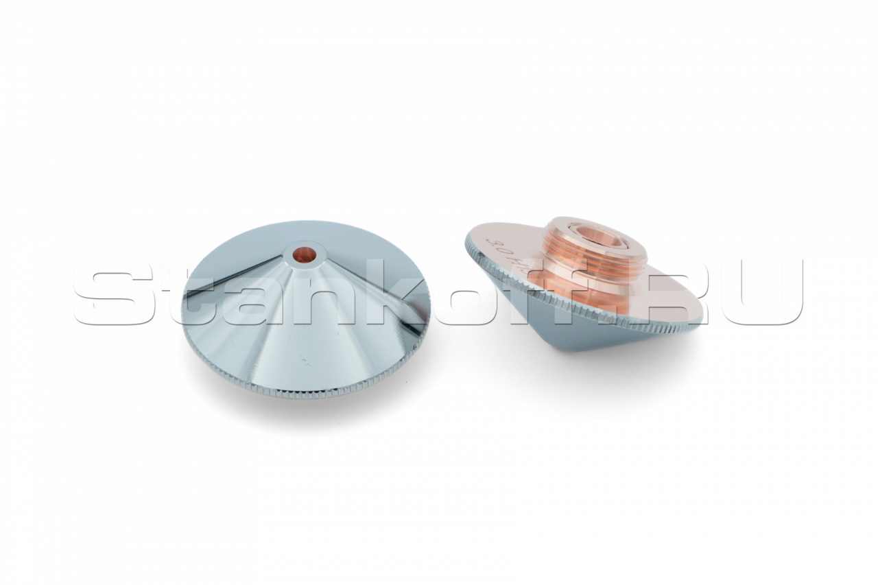 Используется в качестве электрода для корректной работы датчика слежения за поверхностью, а также для подачи лазерного излучения и режущего газа (опционально) в зону обработки. Срок службы зависит от условий эксплуатации. Все сопла Raytools характеризуются прочностью и надежностью. Сопловая часть лазерной головки состоит из керамического держателя и непосредственно сопла. Эта часть обеспечивает соосность лазерного излучения и струи газа. Электролитическое хромирование максимизирует срок эксплуатации, сокращает адгезию при разбрызгивании и обеспечивает стабильное определение высоты. Во всех соплах используется функция центровки, которая позволяет быстро изменять и выравнивать положение сопла. Двойные сопла улучшают качество поверхности при кислородной резке низкоуглеродистой стали. Для полного охвата диапазона толщины сопла имеют диаметр в диапазоне от 0,8 мм до 10 мм.