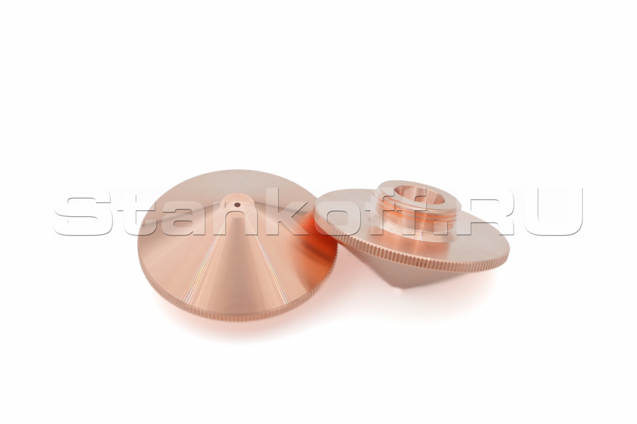 Используется в качестве электрода для корректной работы датчика слежения за поверхностью, а также для подачи лазерного излучения и режущего газа (опционально) в зону обработки. Срок службы зависит от условий эксплуатации. Все сопла Raytools характеризуются прочностью и надежностью. Сопловая часть лазерной головки состоит из керамического держателя и непосредственно сопла. Эта часть обеспечивает соосность лазерного излучения и струи газа. Во всех соплах используется функция центровки, которая позволяет быстро изменять и выравнивать положение сопла. Одинарные сопла используются для резки тонкого материала, нержавеющей стали и алюминия. Для полного охвата диапазона толщины сопла имеют диаметр в диапазоне от 0,8 мм до 10 мм.