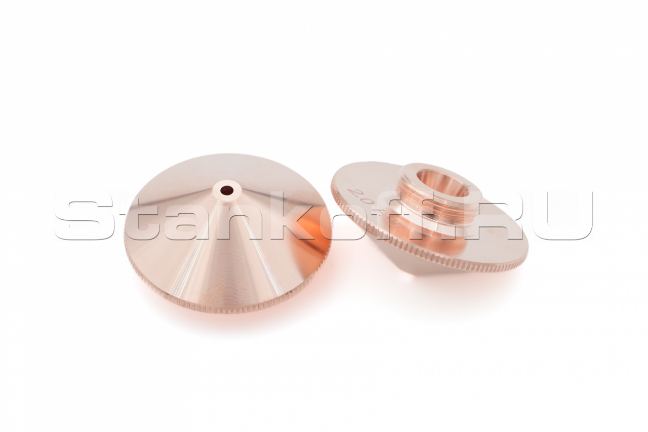 Используется в качестве электрода для корректной работы датчика слежения за поверхностью, а также для подачи лазерного излучения и режущего газа (опционально) в зону обработки. Срок службы зависит от условий эксплуатации. Все сопла Raytools характеризуются прочностью и надежностью. Сопловая часть лазерной головки состоит из керамического держателя и непосредственно сопла. Эта часть обеспечивает соосность лазерного излучения и струи газа. Во всех соплах используется функция центровки, которая позволяет быстро изменять и выравнивать положение сопла. Одинарные сопла используются для резки тонкого материала, нержавеющей стали и алюминия. Для полного охвата диапазона толщины сопла имеют диаметр в диапазоне от 0,8 мм до 10 мм.