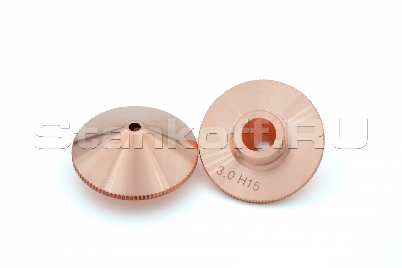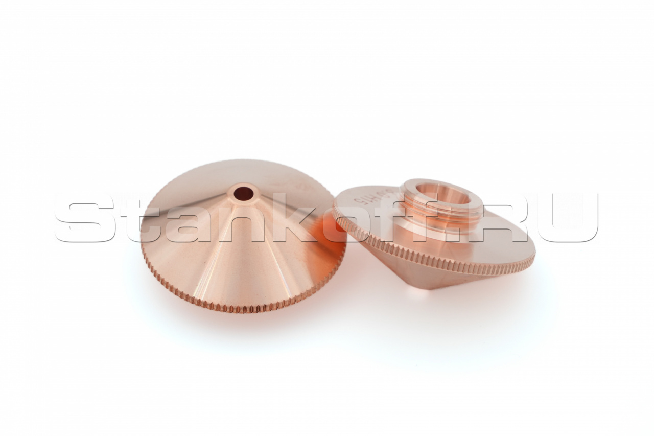 Используется в качестве электрода для корректной работы датчика слежения за поверхностью, а также для подачи лазерного излучения и режущего газа (опционально) в зону обработки. Срок службы зависит от условий эксплуатации. Все сопла Raytools характеризуются прочностью и надежностью. Сопловая часть лазерной головки состоит из керамического держателя и непосредственно сопла. Эта часть обеспечивает соосность лазерного излучения и струи газа. Во всех соплах используется функция центровки, которая позволяет быстро изменять и выравнивать положение сопла. Одинарные сопла используются для резки тонкого материала, нержавеющей стали и алюминия. Для полного охвата диапазона толщины сопла имеют диаметр в диапазоне от 0,8 мм до 10 мм.