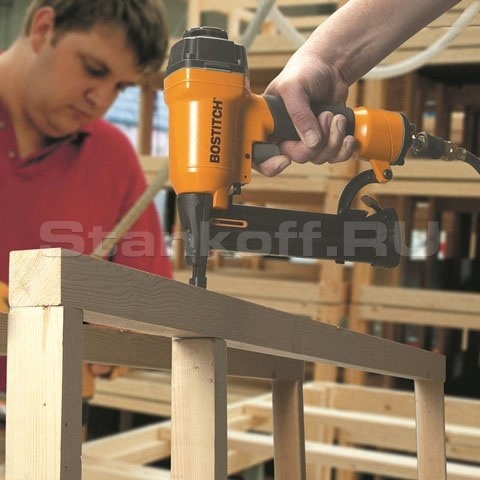 Скобозабивной каркасный пневматический инструмент для скоб среднего сечения. Простой неприхотливый инструмент для промышленного применения на мебельных и столярных производствах, а так же в деревянном домостроении. Широко используется для изготовления уличной мебели, беседок, бытовок, заборов и т.д.