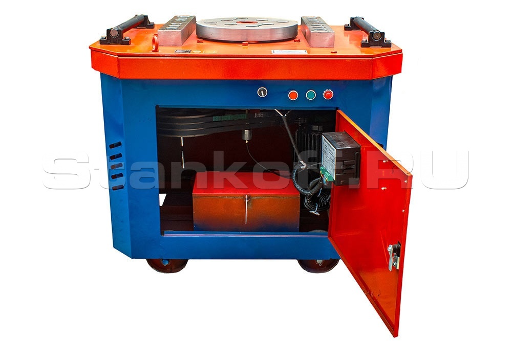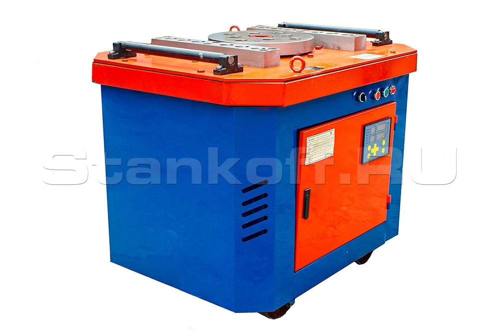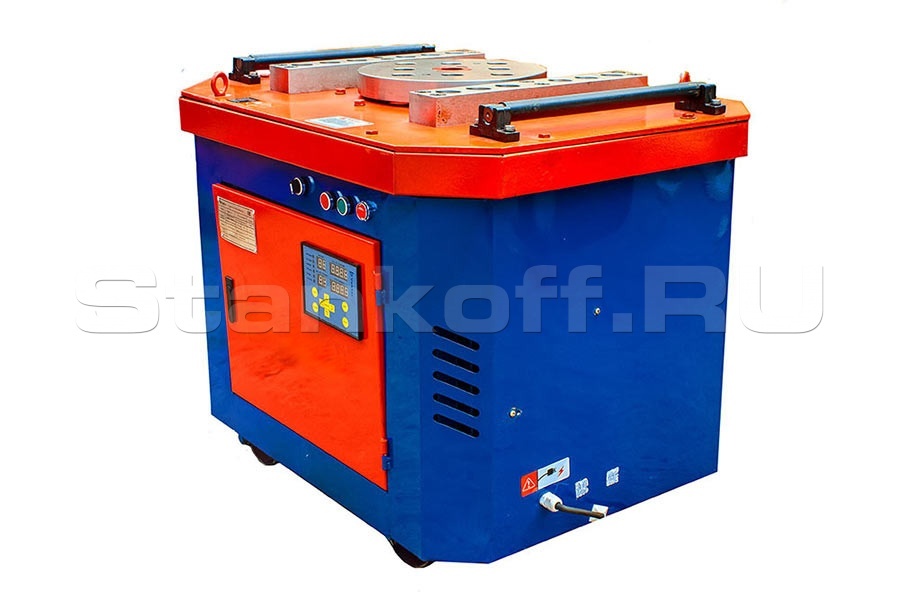 Станок данной модели производит загиб посредством вращения диска с механическим приводом. Управление станком осуществляется электрической системой автоматизации. Такая система позволяет выполнять все необходимые в строительстве углы загибания арматурной стали с максимальной точностью. Загибочный диск вращается в направлении по часовой и против часовой стрелки и работает как в автоматическом, так и в ручном режимах. Для выполнения нестандартных загибов можно использовать различные насадки и аппараты.