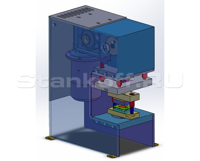 Электромеханический пресс состоит из корпуса в виде двух С-образных пластин соединенных между собой монтажными плитами. На верхней плите расположен силовой кривошипно ползунный механизм, на мощных роликовых подшипниках. С обеих сторон кривошипного вала расположены цепные звездочки крутящий момент на которые поступает от звездочек стоящих на валу червячного мотор редуктора. За счет вращения кривошипного вала кривошипно-шатунный механизм приводит в движение подвижную траверсу (плиту) та которой закреплен замок для быстросменной фиксации хвостовиков штампов.