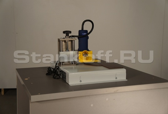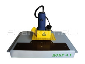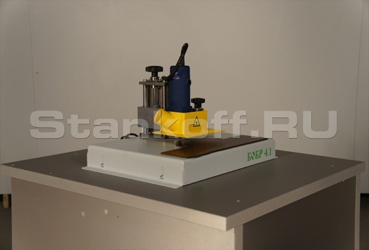 Фрезерный станок БОБР 4.1 предназначен для снятия свесов кромочных материалов по пласти в условиях малого производства или в качестве дополнения в большом производстве, где необходимо снимать свесы на специальных заготовках. Основным преимуществом станка является его простота и стоимость, наличие качественной чистовой обработки благодаря высокочастотному двигателю с частотой вращения фрезы 32,000 об/мин. Станок укомплектован фрезой r=2 мм
