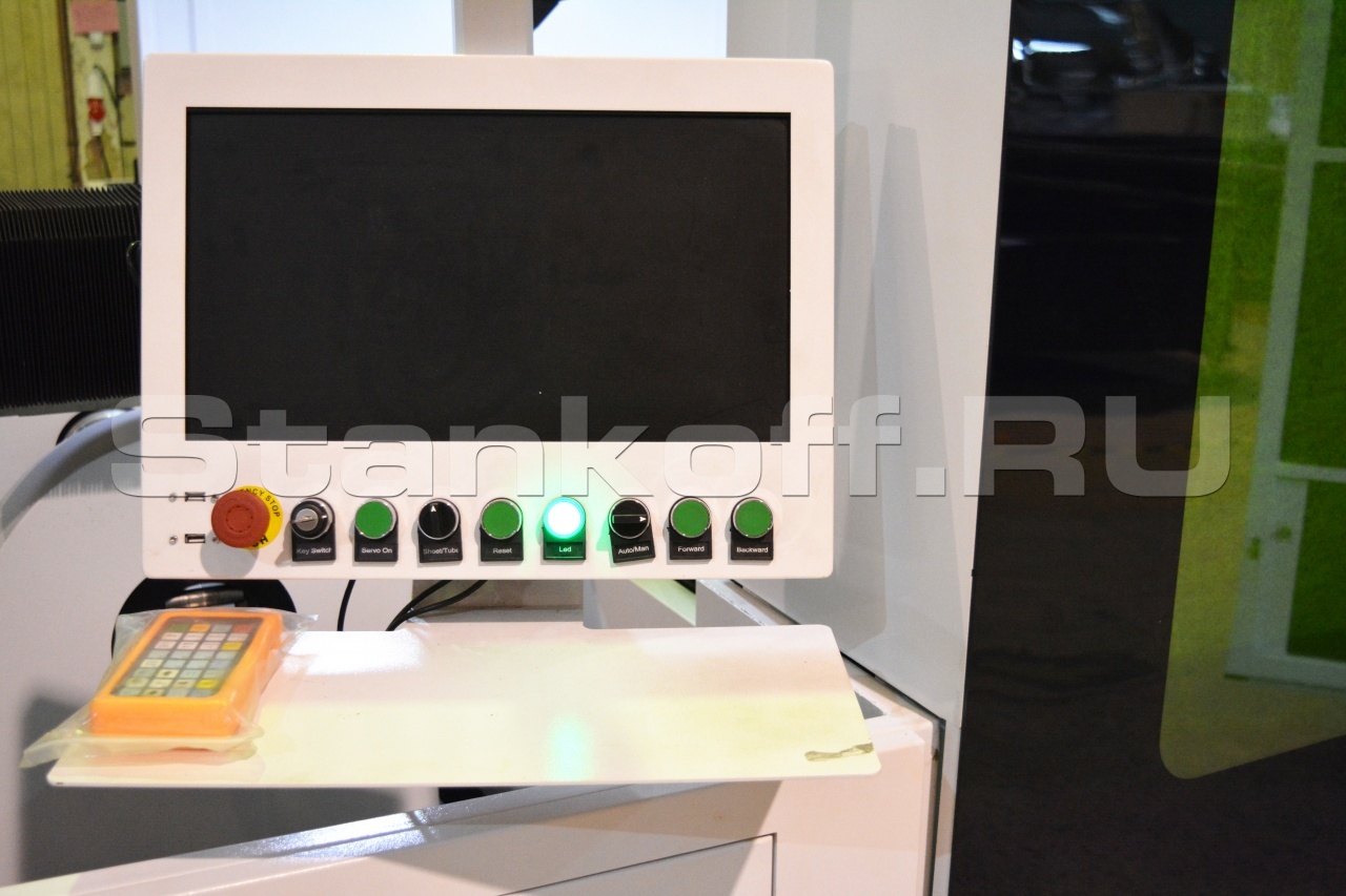 Позволяет оператору выполнять наиболее востребованные действия, не подходя к ЧПУ. Запуск/остановка программ, обратный ход, увеличение/уменьшение фокусного расстояния, изменение скорости подачи. Позволяет сократить время позиционирования режущей головы на 30%. Дает возможность контролировать раскрой и оперативно реагировать при необходимости.