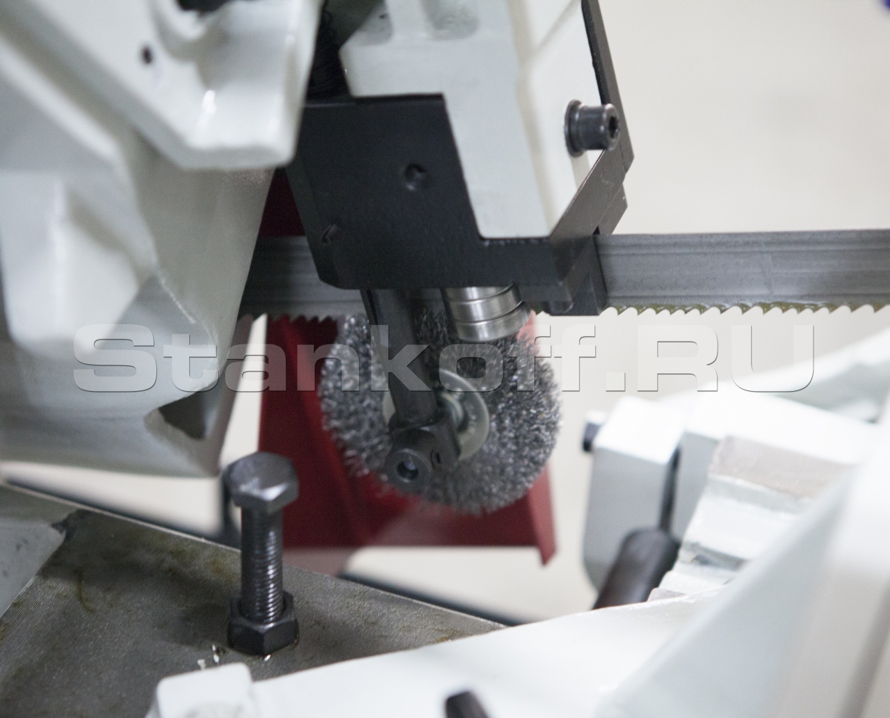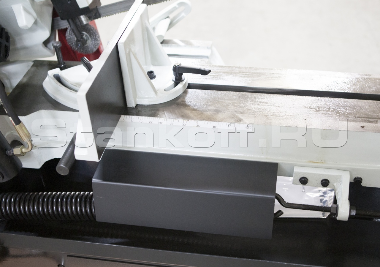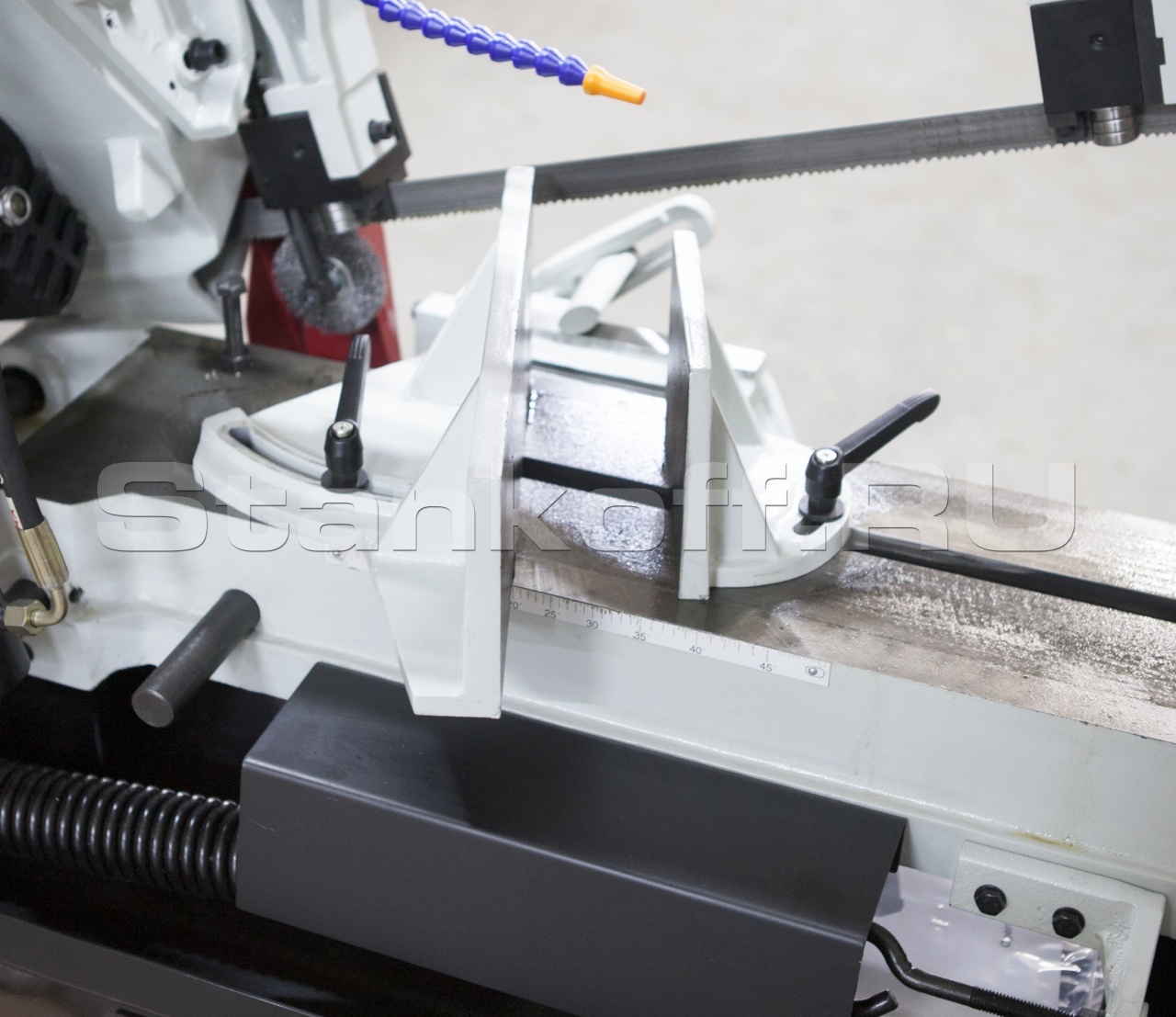 В рабочей зоне резания полотно точно ведется двумя направляющими головками. Станок имеет поворот губок тисков, для пиления под углом необходимо изменять угол установки тисков. Высота полотна 27мм позволяет пилить c высокой точностью и параллельностью полые и профильные заготовки под различными углами, в том числе и сплошные заготовки. Расстояние от пола до тисков составляет 580 мм.