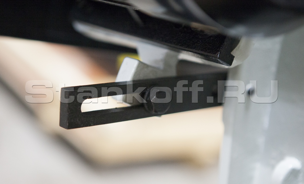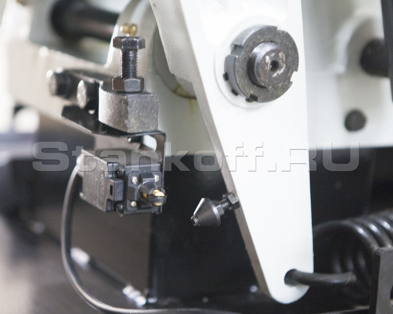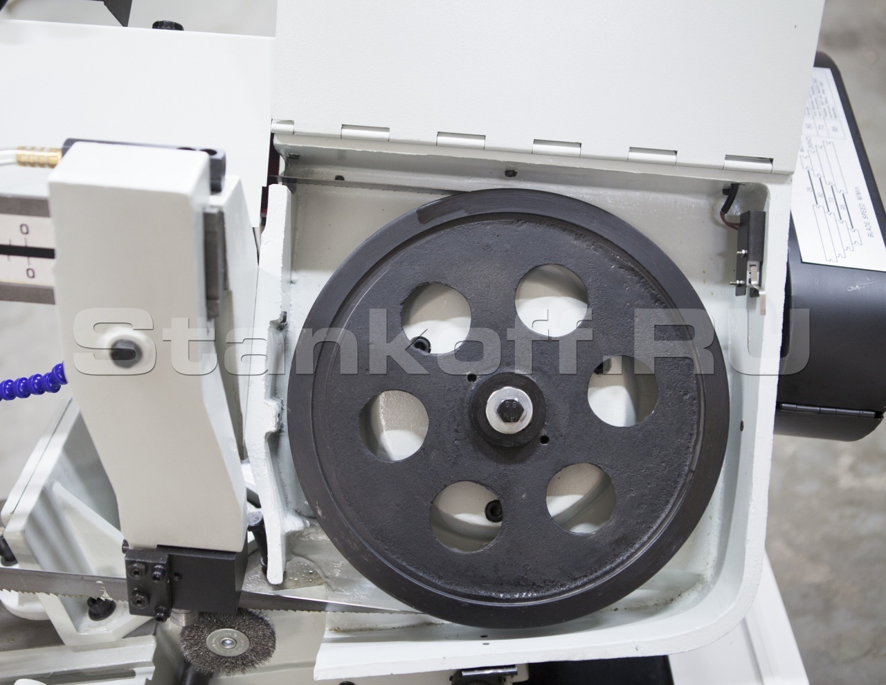 В рабочей зоне резания полотно точно ведется двумя направляющими головками. Станок имеет поворот губок тисков, для пиления под углом необходимо изменять угол установки тисков. Высота полотна 27мм позволяет пилить c высокой точностью и параллельностью полые и профильные заготовки под различными углами, в том числе и сплошные заготовки. Расстояние от пола до тисков составляет 580 мм.