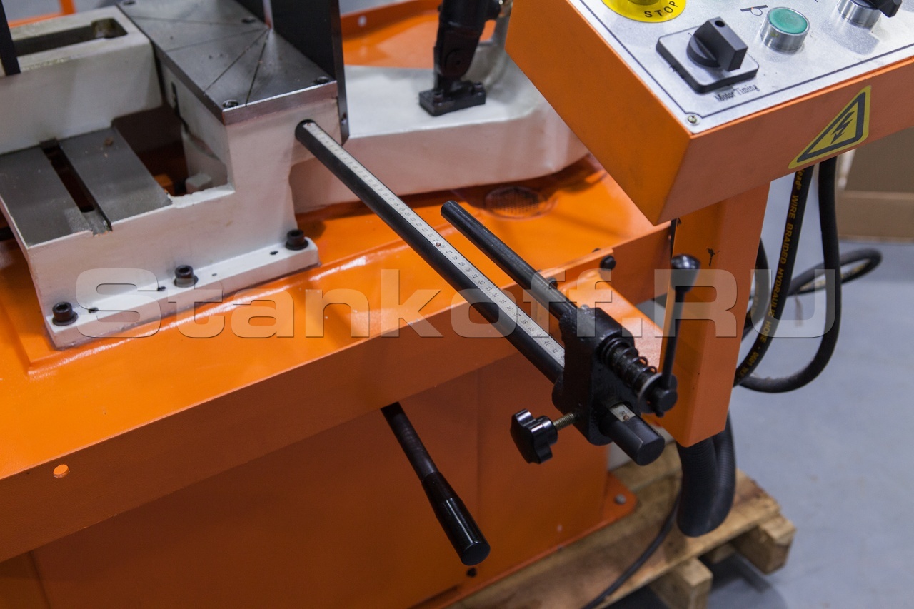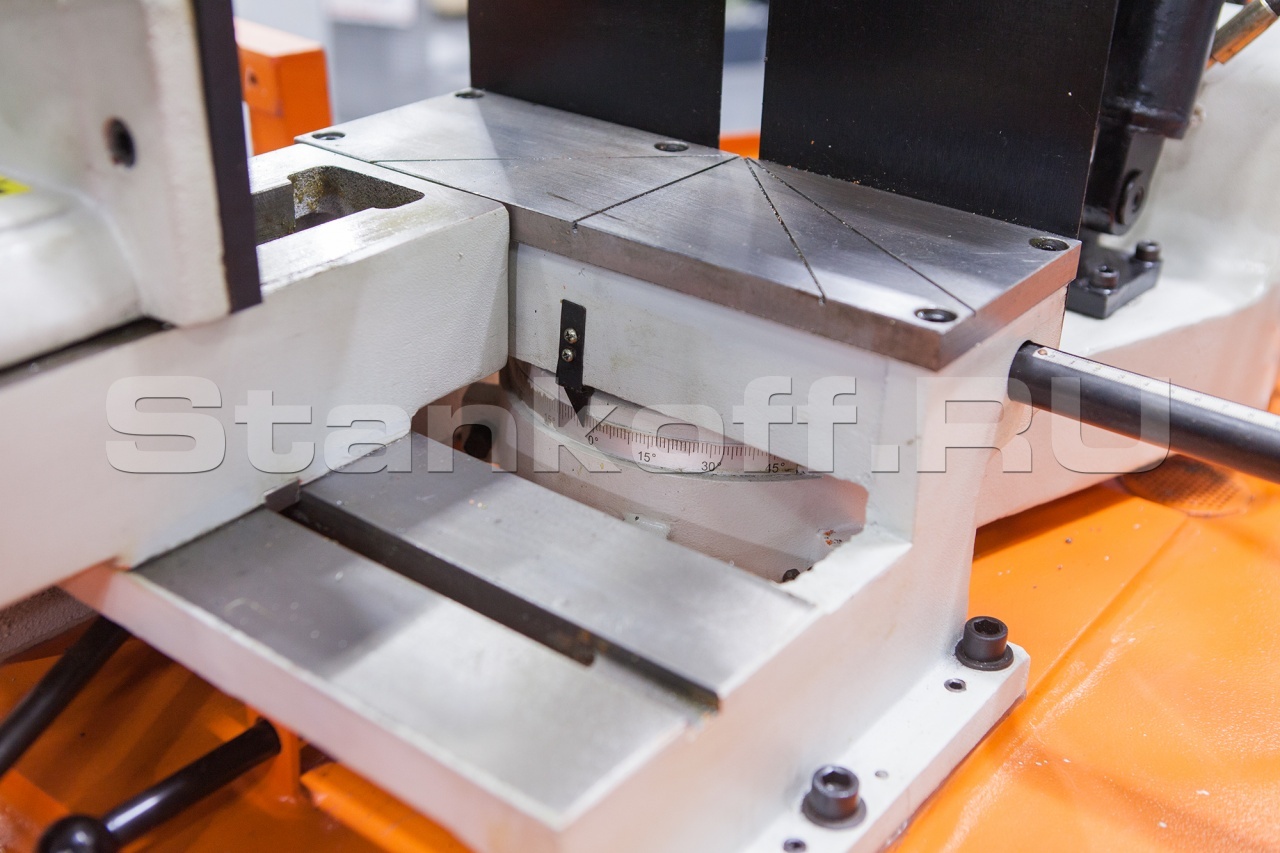 В рабочей зоне резания полотно точно ведется двумя направляющими головками. Станок с возможностью поворота корпуса пилы от -45° 0° до +60°, предназначен для пиления заготовок, под различными углами и при частой смене угла пила (т.е. поворота рамы пилы по градусной линейке относительно неподвижных тисков).