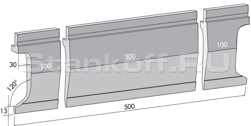 Пуансон гусевидного типа. Предназначен преимущественно для гибки деталей с длинными полками из различных вариантов толщин листового металла. Изготовлен из высококачественной легированной стали 42Cr (900-1150 Н/мм2). Рабочие поверхности закалены методом индукционной закалки до HRC 54-60 (1980-2200 Н/мм2). Все рабочие, крепёжные и стыковочные поверхности пуансона шлифованы.