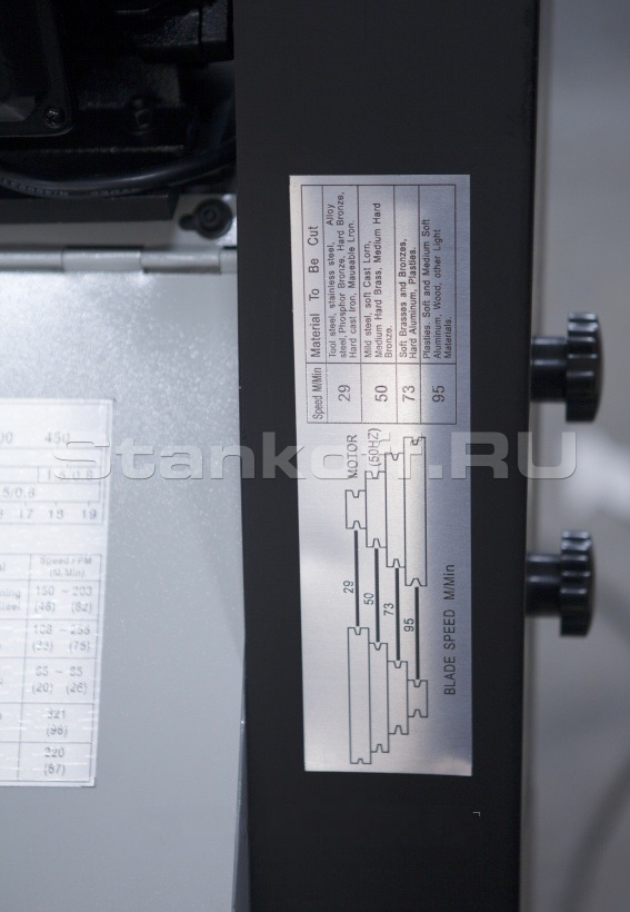 В рабочей зоне резания полотно точно ведется двумя направляющими головками. Станок имеет неподвижные тиски и поворотный механизм рамы, для пиления под углом необходимо изменить положение рамы относительно неподвижных тисков. Высота полотна 27мм позволяет пилить c высокой точностью и параллельностью полые и профильные заготовки под различными углами, в том числе и сплошные заготовки.