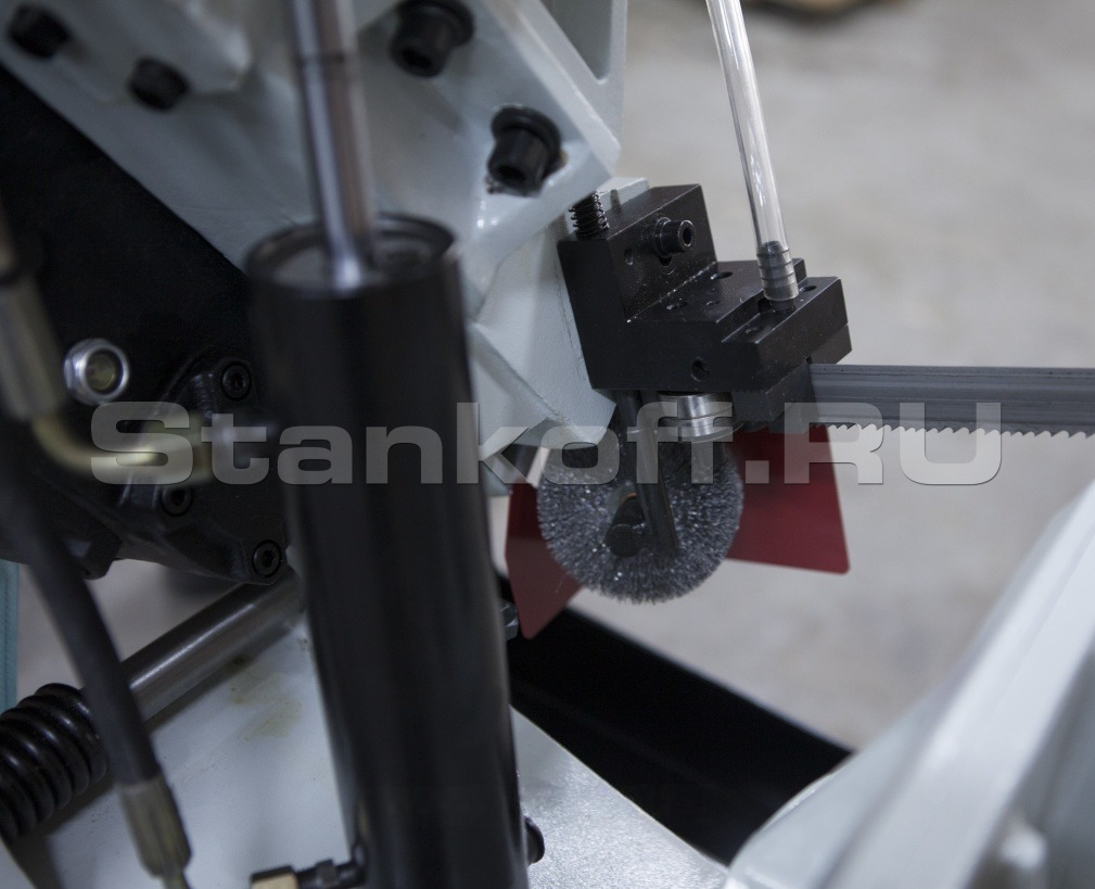 Механическая дисковая щётка (приводимая в движение от движения полотна).Зубчатый блок, с твёрдосплавными платинами и подшипниками для выпрямления полотна в зоне резания и качественной фиксации для стабильного пиления.
