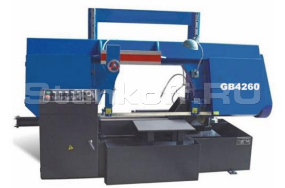 Модель GB 4260 является гидравлическим ленточнопильным станком, колонного двухстоечного типа. Полуавтоматический ленточнопильный станок, предназначен для пиления труб и сплошных заготовок, максимальным диаметром круга 600 мм и прямоугольной заготовки 600x700 мм под углом 90°. Двухстоечный ленточнопильный станок имеет 2 вертикальные стойки (колонны) по которым перемещается горизонтальная пильная рама, образуя жёсткий замкнутый контур с высокой стабильностью реза.