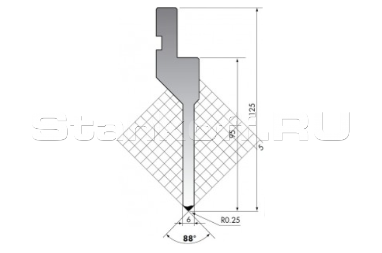 Пуансон прямого типа. Предназначен преимущественно для гибки деталей с большими и средними полками из различных вариантов толщин листового металла. Изготовлен из высококачественной легированной стали 42Cr (900 - 1150 Н/мм2). Рабочие поверхности закалены методом индукционной закалки до HRC 54 - 60 (1980 - 2200 Н/мм2). Все рабочие, крепёжные и стыковочные поверхности пуансона шлифованы.