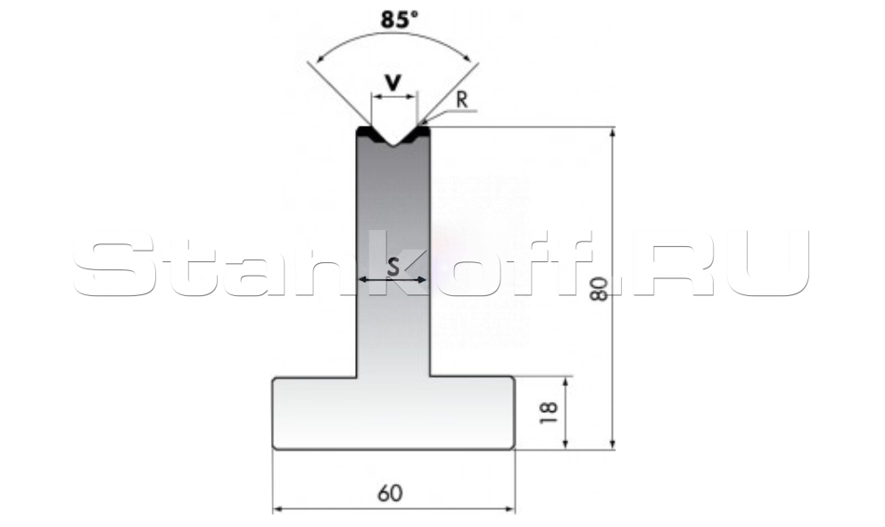 Матрица с одним раскрытием (ручьём) средней ширины предназначена для гибки средних толщин листового металла. Не имеет возможности поворота. Изготовлена из качественной конструкционной стали C45 (560 - 710 Н/мм²). Рабочие поверхности закалены методом индукционной закалки до HRC 54-60 (1980 - 2200 Н/мм²). Все рабочие, крепёжные и стыковочные поверхности матрицы шлифованы.