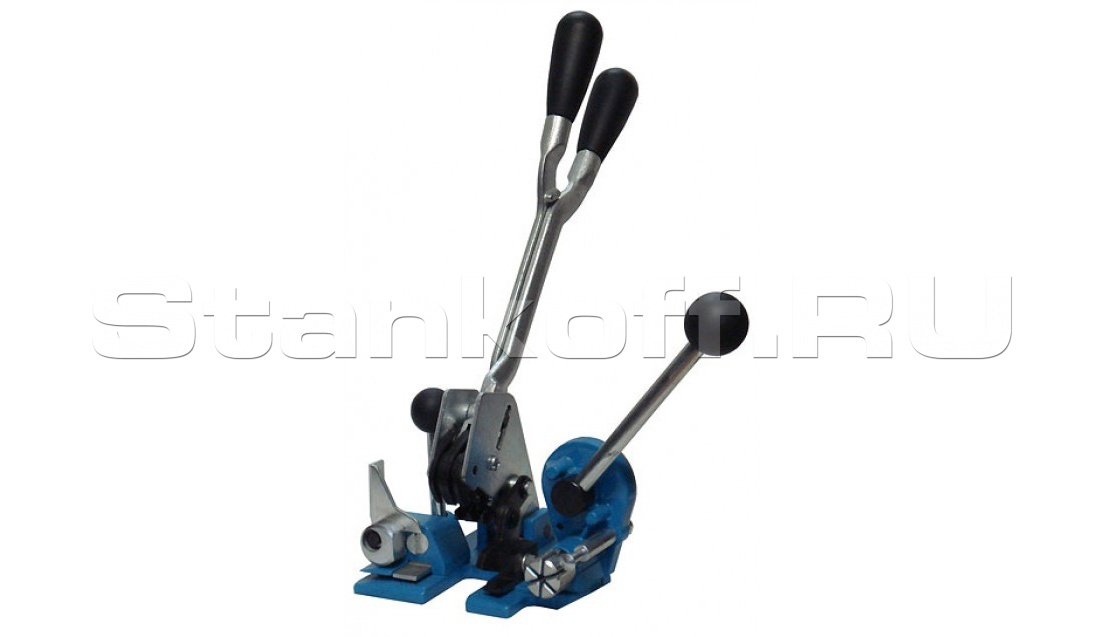 Комбинированное устройство для обвязки грузов полипропиленовой ПП лентой с использованием скобы. Выполняет три операции: натяжение, скрепление металлической скобой и обрезание ленты ПП.