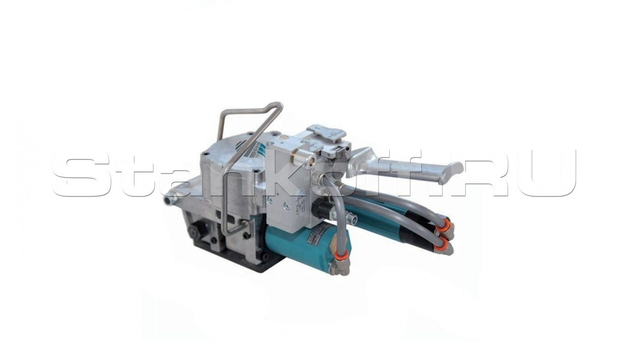 Данный инструмент весит - 5,1 кг. Ширина используемой ленты варьируется от 13 до 19 мм, а толщина от 0,7 до 1,4 мм. Максимальное натяжение регулируется и может достигать до 3500 Н (до 357 кгс) при давлении в магистрали сжатого воздуха 6 атм. Величину силы, с которой натянута лента и время сваривания можно легко отрегулировать в зависимости от ее толщины и ширины, а также типа. Скорость натяжения составляет при этом 9 м/мин. Эффективность соединения, составляет 80% от максимального усилия на разрыв в зависимости от качества расходного материала.