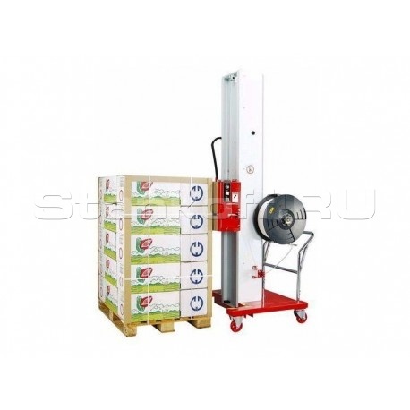 Полуавтоматическая стреппинг машина TP-502MН для горизонтальных обвязок паллет. Легко перемещается по складу на колесах. Оператор вручную продевает ленту. Автоматическое натяжение и фиксация ленты трением.