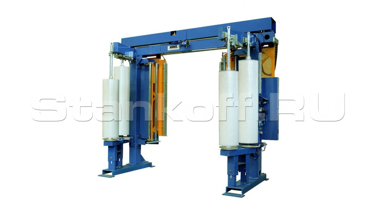 AT01 - автоматическое оборудование для обертывание груза на паллете в термоусадочную пленку. Груз на паллете проходит насквозь натянутую пленку. Далее происходит разматывание, обертывание, запайка и отрезание пленки автоматически. Данная модель может быть оснащена тройным размотчиком пленки, для автоматической смены рулона в зависимости от размеров груза.