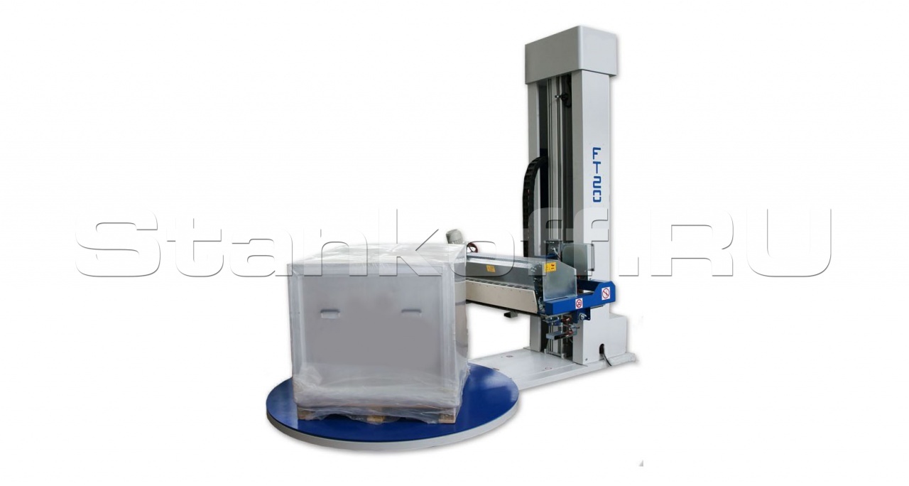 FT-20 - полуавтоматический термоусадочный паллетоупаковщик. Оператор устанавливает паллет на поворотный стол при помощи гидравлической тележки или погрузчика. Одевает вручную термоусадочный колпак. Затем запускает цикл упаковки.