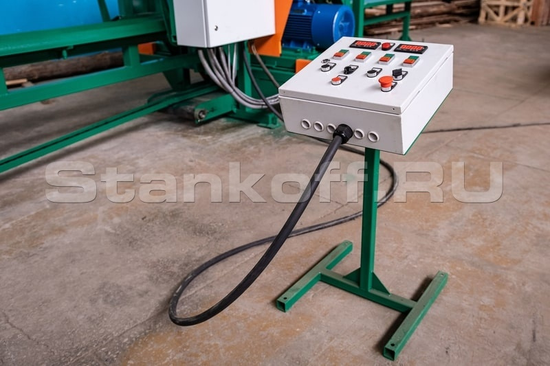 Двухвальный бревнопильный станок «Тополь-450» предназначен для распиловки бревен диаметром до 450 мм для получения лафета и бруса. Размер между пилами устанавливается при помощи винтовой пары вручную и фиксируется прижимными гайками. Бревно устанавливается по центру стола и при помощи цепной передачи передвигается в зону пиления. Для регулировки скорости подачи станок оснащен частотным преобразователем позволяющим изменять скорость от 0 до 22 м/мин. В электрошкафу предусмотрен термостат для поддержания рабочей температуры. На станке предусмотрен выносной пульт управления в базовой комплектации.