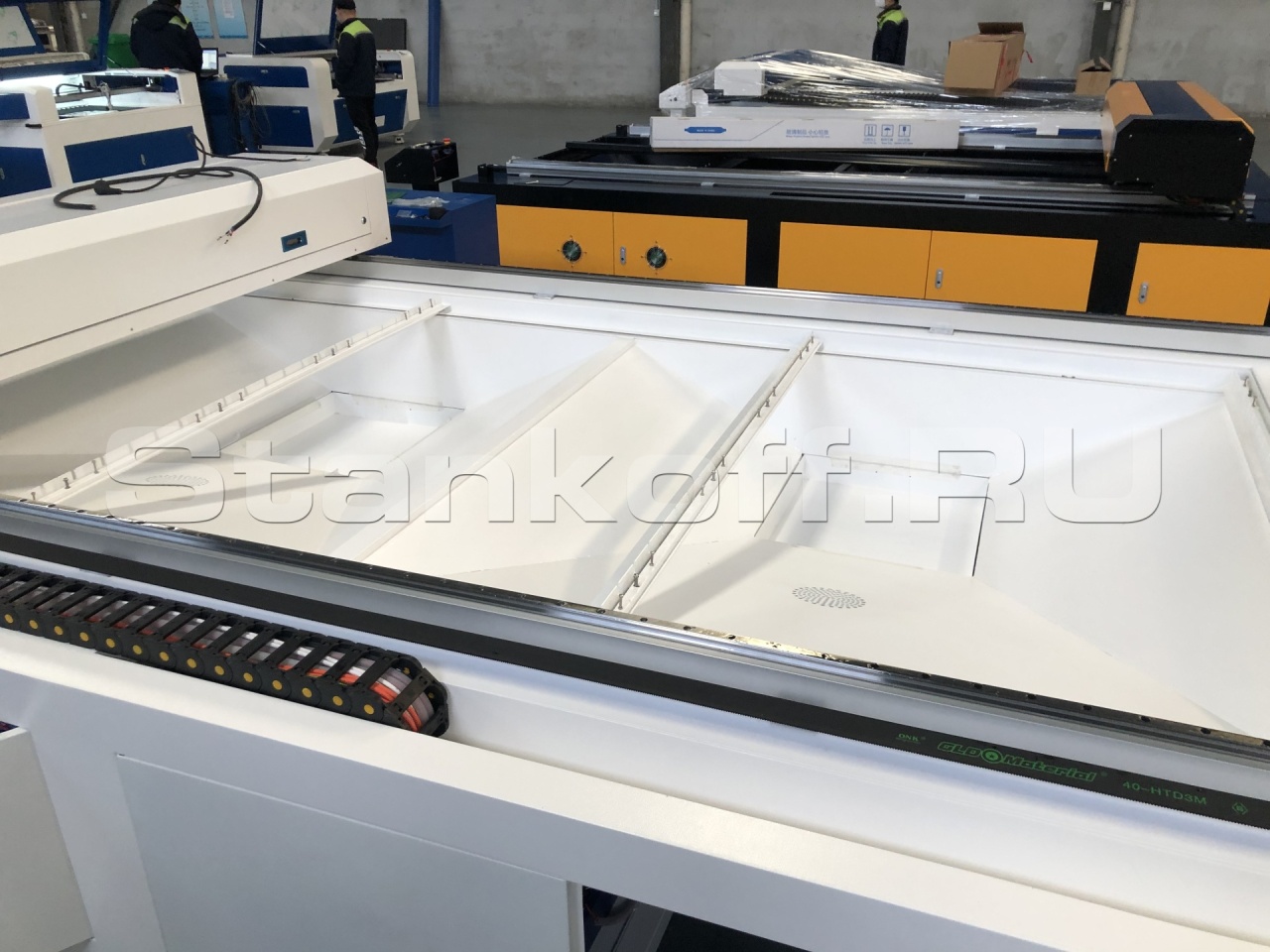Стол из анодированного алюминия. Позволяет осуществлять на станке операции лазерной резки и лазерной гравировки. Реечный стол позволяет обеспечить высокое качество реза. Лазерный луч, прорезая материал на реечном столе, не будет отражаться обратно в материал. Площадь соприкосновения с материалом на реечном столе очень мала, т.к. материал кладется на малое количество ламелей, что уменьшает контакт материала с обратной стороны и минимизирует метки и позволяет избежать подгорания материала.Материал можно положить на меньшее количество ламелей, что будет уменьшать контакт материала с обратной стороны и минимизировать метки