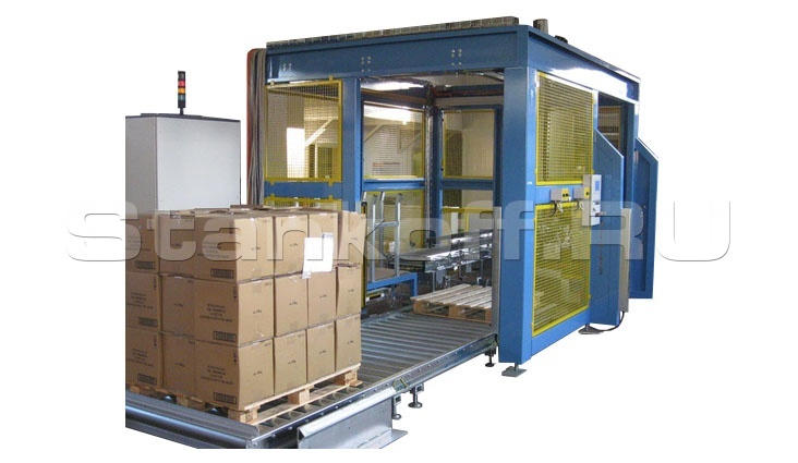 Кооридинатный паллетайзер для укладки на паллет коробок, термоусадочных блоков, канистр, мешков. Нижняя подача продукции. Укладка осуществляется на неподвижный паллет. Может быть автоматическим и полуавтоматическим. Автоматическая версия оснащена магазином пустых паллет, конвейером для перемещения готового паллета. При необходимости может быть автоматическая укладка межслойной прокладки.