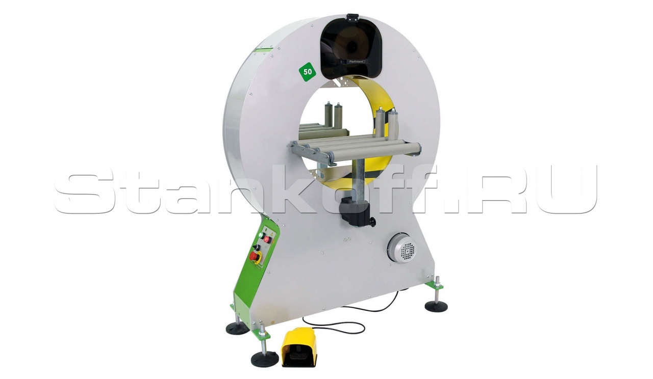 Цикл обмотки полуавтоматический. Начало и окончание вращения кольца от педали. Автоматическая подача пленки в начале цикла, захват и обрезание в конце цикла можно установить опционально. За счет использования двух кареток с пленкой, продукция во время обмотки стабилизирована без использования прижимов. Обмотчик может оснащаться подвесными столами с неприводными конвейерами. Они регулируются по высоте и ширине. Столы оснащены вертикальными, упорными роликами.