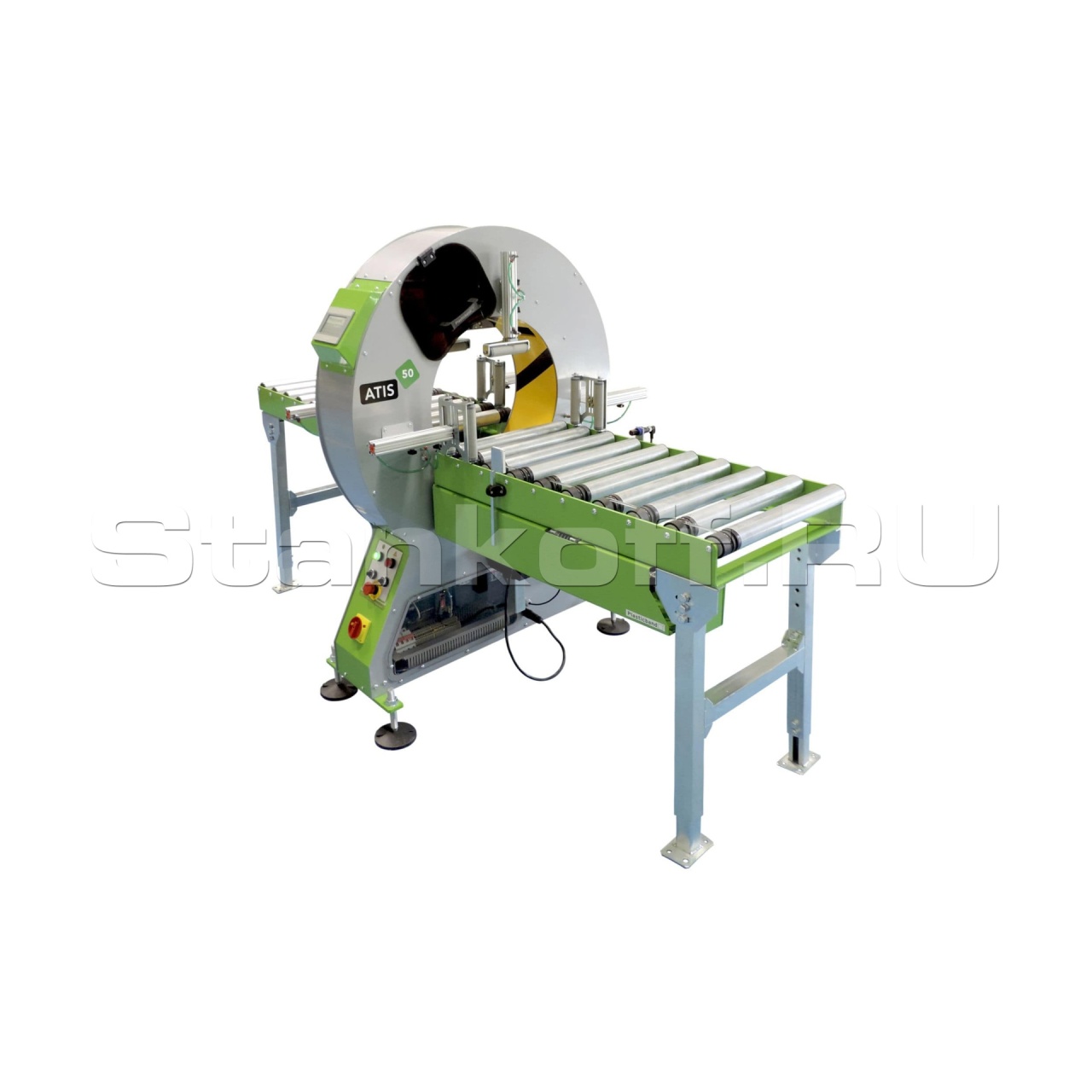 Автоматический горизонтальный обмотчик в стрейч пленку ATIS-50. От бюджетных моделей отличается наличием приводных конвейеров на входе и выходе из кольца. Цикл обмотки начинается и завершается автоматически по фотодатчикам. Автоматическая подача пленки. Автоматическое опускание прижимных устройств. Автоматическое обрезание и захват пленки в конце цикла.