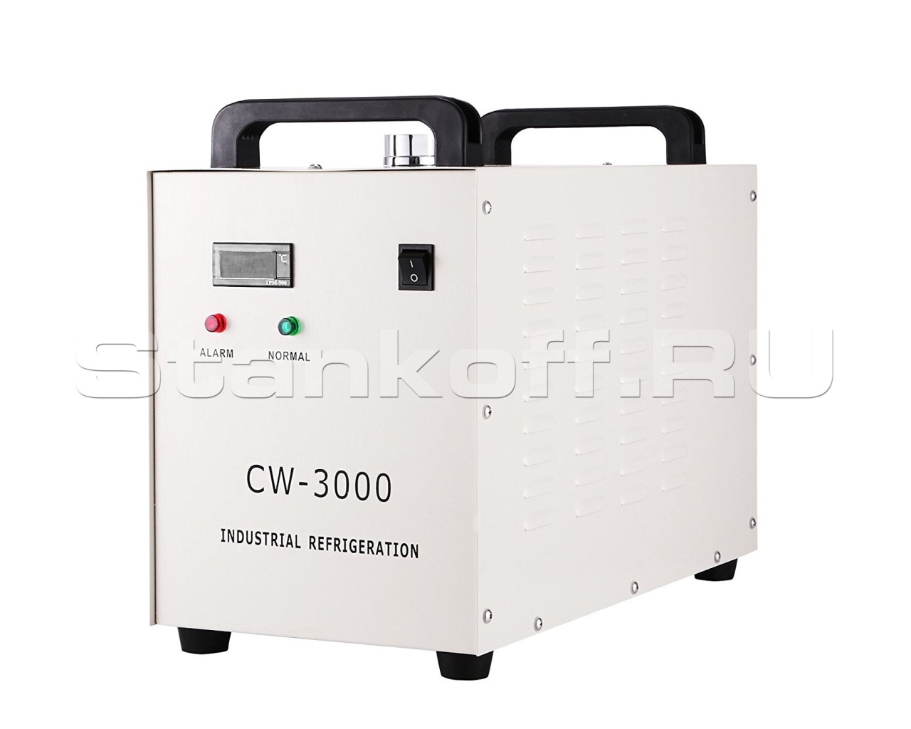Чиллер CW-3000AG оснащен встроенным баком, объемом до 9 литров. Мощность прибора составляет 50 w/℃ при высшем уровне потребления в 120 Вт. Для исключения перегрева лазерной трубки следует учитывать наличие теплоотвода. Чиллер CW-3000 является надежным источником системы охлаждения для лазерных трубок, мощность. до 80 Вт. Также следует учитывать, что если температура помещения выше 25 градусов, то такой чиллер лучше не использовать, либо предусмотреть дополнительную систему охлаждения помещения. Есть практика, когда чиллеры подобного типа помещались в охлаждающий элемент, но при этом надо учитывать, чтобы стенки чиллера не соприкасались с емкостью для хранения.