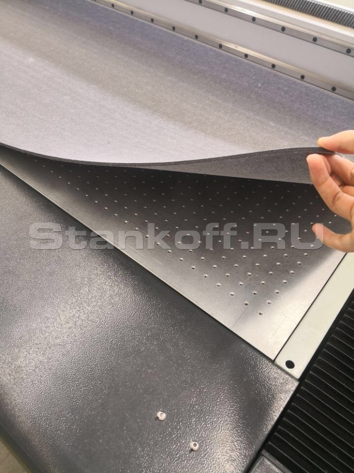 Для крепления материала станок оборудован системой вакуумного прижима. С помощью вихревой воздуходувки на 7,5 кВт. В профиле рабочего стола раскройщика создаётся зона пониженного давления, и через отверстия в столе создаётся прижим материала. Сила прижима настолько велика, что лист материала метр на метр невозможно сдвинуть руками. При работе ножами используется специальная подложка, по своей структуре напоминающая войлок, но, в отличии от него, не пропускающая воздух вдоль материала. Кроме этого, на станке предусмотрено крепление винтами, для этого на рабочей поверхности плоттера есть резьбовые отверстия М6.