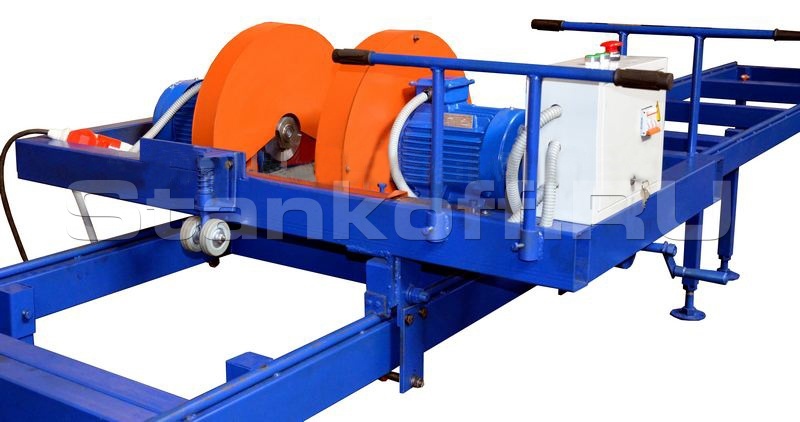 Конструкция кромкообрезного станка выполнена в виде каретки с пильным узлом, перемещающейся по неподвижному столу с лежащей на нем заготовкой. Подача пильной каретки вдоль заготовки осуществляется вручную.