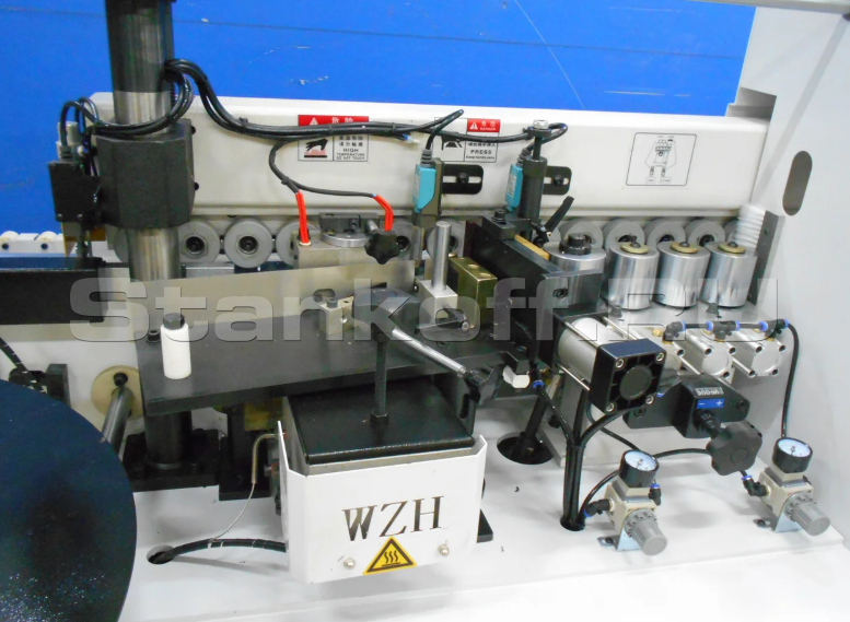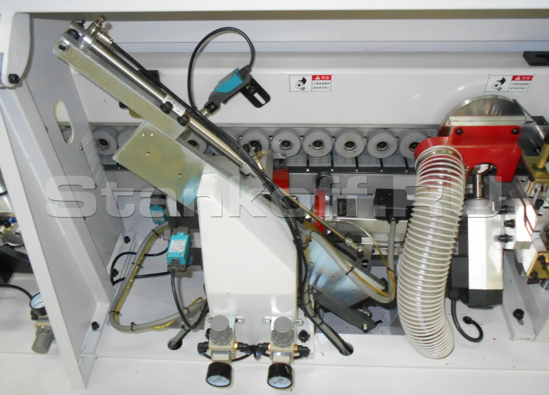 - Качественная проклейка кромки – за счет того, что усилие пресс-группы пневматическое, кромочный материал качественно приклеивается к заготовке.