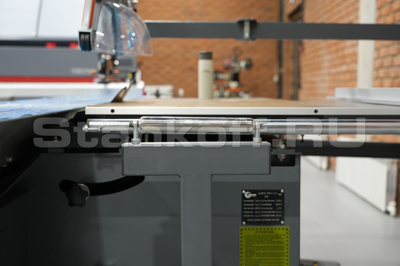 Роликовая каретка со стальными цилиндрическими направляющими обеспечивает высочайшую точность и качество распиловки. Практика и основные производители показывают, что на сегодняшний день такой тип каретки наиболее надежен, долговечен и практически не требует технического обслуживания.Линейка
