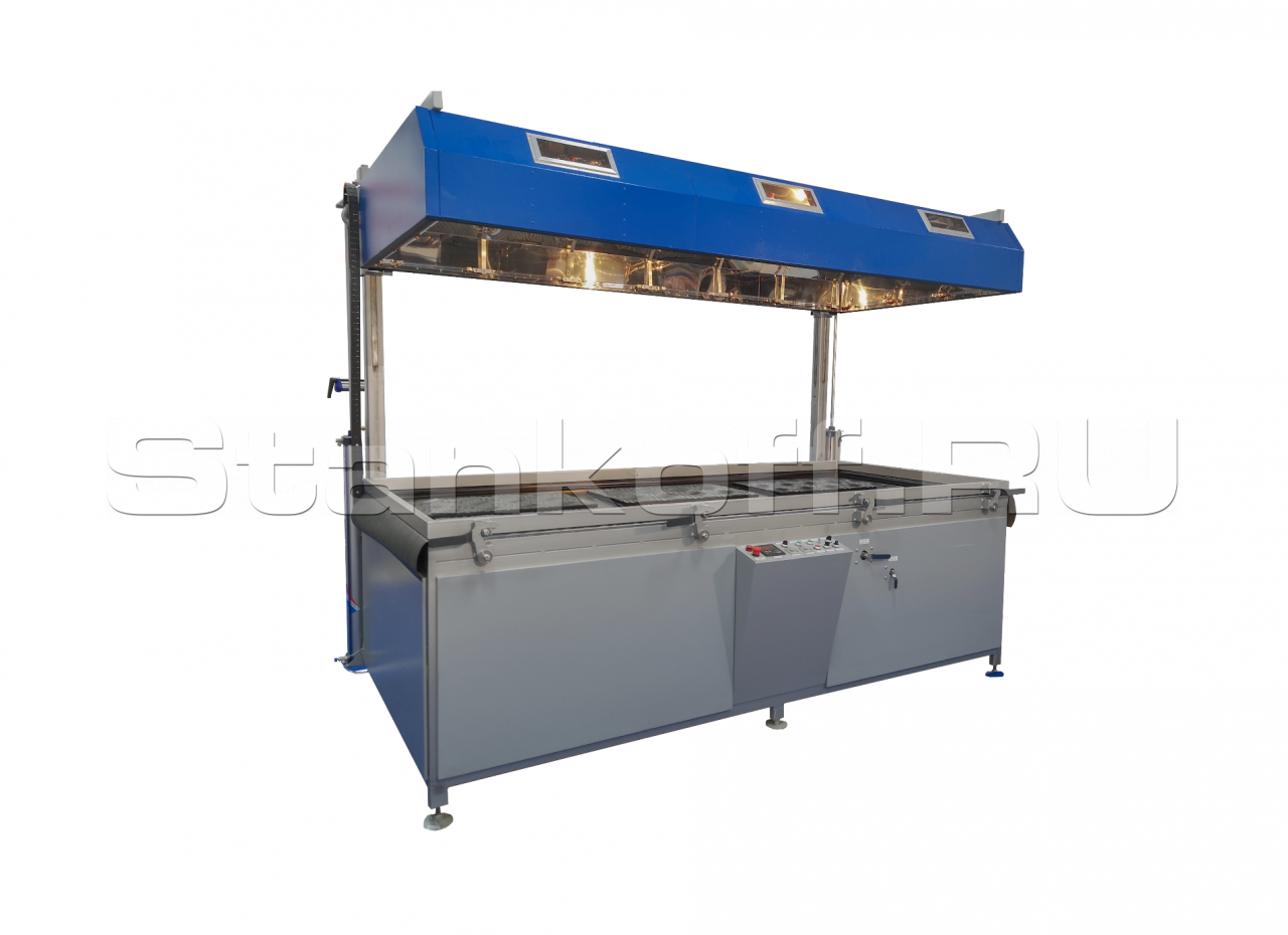 Станок комплектуется низко инерционными галогеновыми лампами мощностью 600Вт., расположенными как в верхней части нагревательного купола, так и по нижнему периметру. Общий уровень энергопотребления термомодуля 24 кВт. Для облегчения подъёма-опускания термомодуля применяются спаренные газовые упоры (мощность газовых упоров подбирается под каждый станок индивидуально).