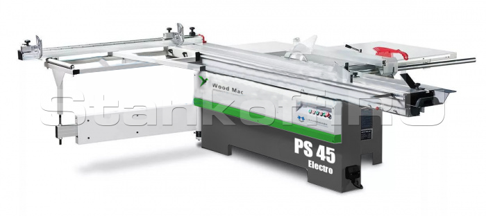 В базовом исполнении станок оснащен двумя расширинтельными столами. Первый по ширине, для обеспечения максимального распила по боковому упору, второй стол задний, который является базовой опорой для отрезаемой детали, и удерживает ее на станке после распила.| Технические характеристики форматно-раскроечного станка WoodMac PS 45 Electro |