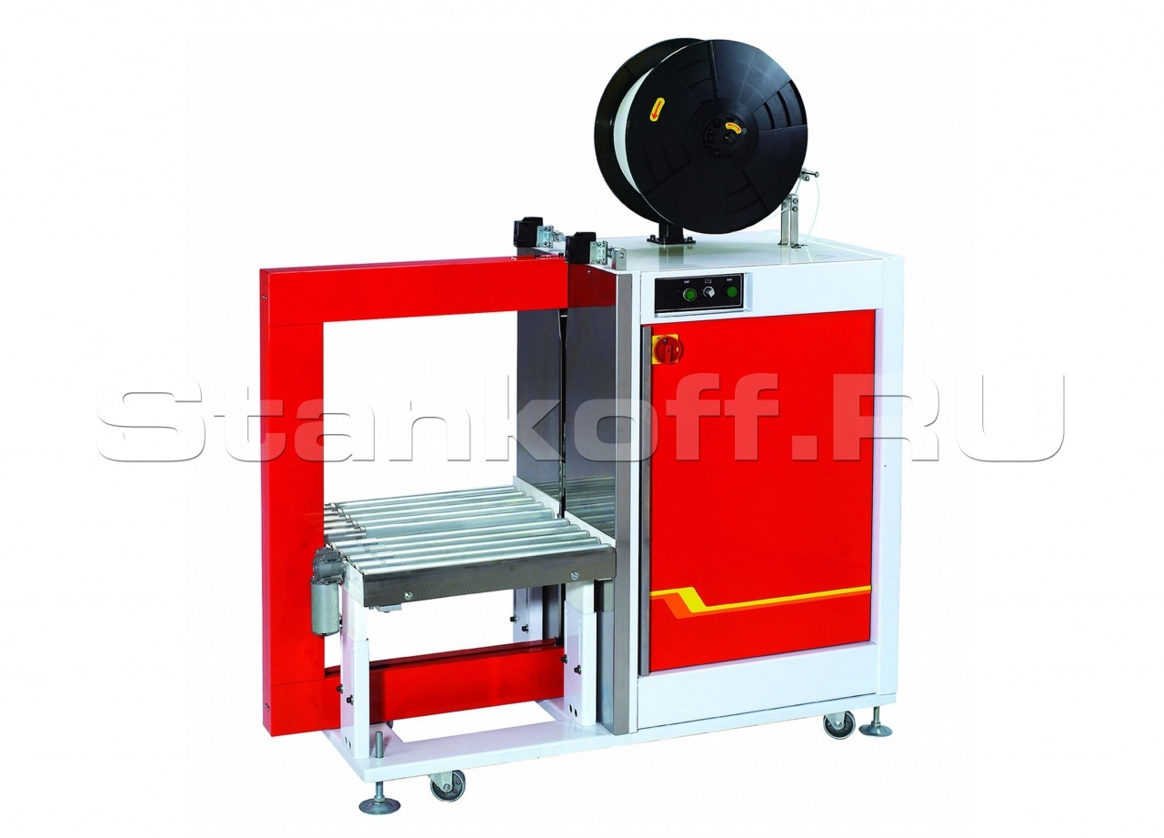 Имеет вариацию настроек обвязки: одна обмотка, две обмотки или транзит упаковки. Сила натяжения ленты контролируется электронной системой, а после установки новой бобины, лента автоматически подается. Автоматический выброс ленты помогает избежать её застревания. Конвейер позволяет автоматизировать и ускорить процесс упаковки, двигая продукцию с регулируемой скоростью 10 – 40 м/мин.