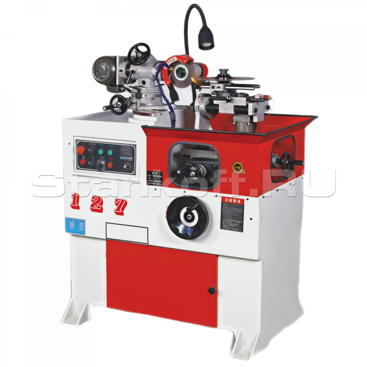 Весь процесс осуществляется автоматически, так как с ПУ задается программа заточки, вводятся форма зубьев и параметры дисковой пилы – количество зубьев, углы скоса зубьев в зависимости от формы. Параметры заточки (диаметр, съем, передний и задний углы и т. п.) настраиваются механически. Количество зубьев в момент заточки отображается на дисплее и отсчитывается в обратном порядке. По завершению процесса, рабочий цикл останавливается и срабатывает сигнальная лампа (система оповещения). Параметры заточки и индикация рабочего процесса отображаются на ЖК дисплее.