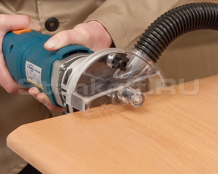 В соответствии с требованиями к профессиональному инструменту фрезер оснащен системой пылеудаления, включающей помимо кожуха пылеудаления три сменные пластины с отверстиями D20, 26 и 30 мм для фрез различного диаметра и систему торможения внешней обоймы опорного подшипника.