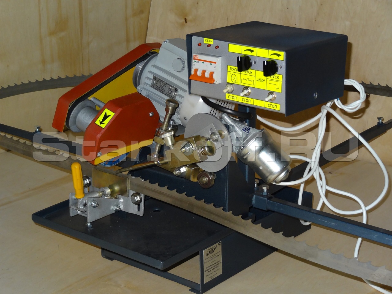 Станок предназначен для заточки ленточных пил любой формы зуба отечественного и импортного производства в автоматическом режиме. Заточка производится по передней и задней грани зуба. Скорость подачи ленточной пилы в зону заточки плавно регулируется. Прижим пилы в держателе осуществляется пружиной, поджимаемой регулировочной гайкой, что позволяет пиле плавно и равномерно перемещаться в процессе заточки зубьев пилы с постоянным нормированным усилием.