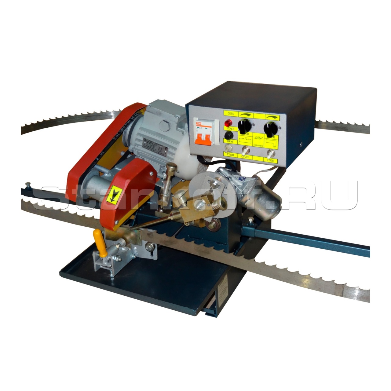 Станок предназначен для заточки ленточных пил любой формы зуба отечественного и импортного производства в автоматическом режиме. Заточка производится по всей поверхности зуба, с разделенной регулировкой величины снимаемого припуска по передней и задней поверхности с использованием СОЖ или без нее. Скорость подачи ленточной пилы в зону заточки плавно регулируется. Позволяет использовать электрическое питание от однофазной сети переменного тока напряжением 220В.