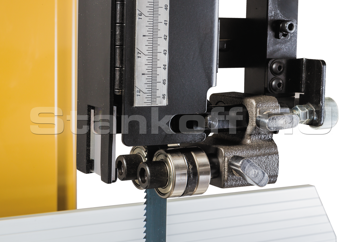 С технической точки зрения конструкция станка представляет собой сочетание основательности и внимания к деталям. О первой красноречиво говорит вес – почти 400 кг. Все ответственные узлы изготовлены с большим запасом прочности, что позволяет работать с крупными заготовками, не опасаясь поломок, обеспечивает высокую жёсткость и, как следствие, отсутствие вибраций. О втором – удобство, с которым производятся все настройки и регулировки. К примеру, наклонный механизм стола имеет кроме фиксатора и транспортирной шкалы зубчатый привод от маховика. Все вращающиеся рукоятки с полированным ободом, что и красиво, и эргономично; запоры на дверях быстрозажимные по подобию замков. Есть все привычные профессионалам системы: реечная регулировка верхних направляющих, натяжитель ленты со стрелочным индикатором усилия, рычаг для быстрого ослабления полотна и даже педаль остановки с механическим тормозом выбега шкивов (альтернатива выключателю на панели). Станок может работать как с широкими лентами (до 40 мм), так и с самыми узкими 3-миллиметровыми, что позволяет качественно выполнять и прямые, и криволинейные резы. Трёхточечные направляющие роликовые, с удобным и точным механизмом настройки.