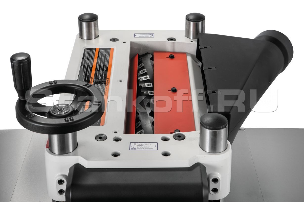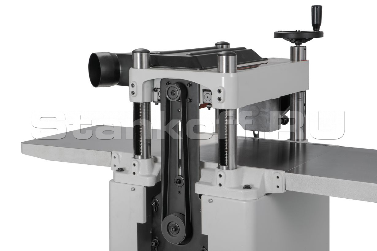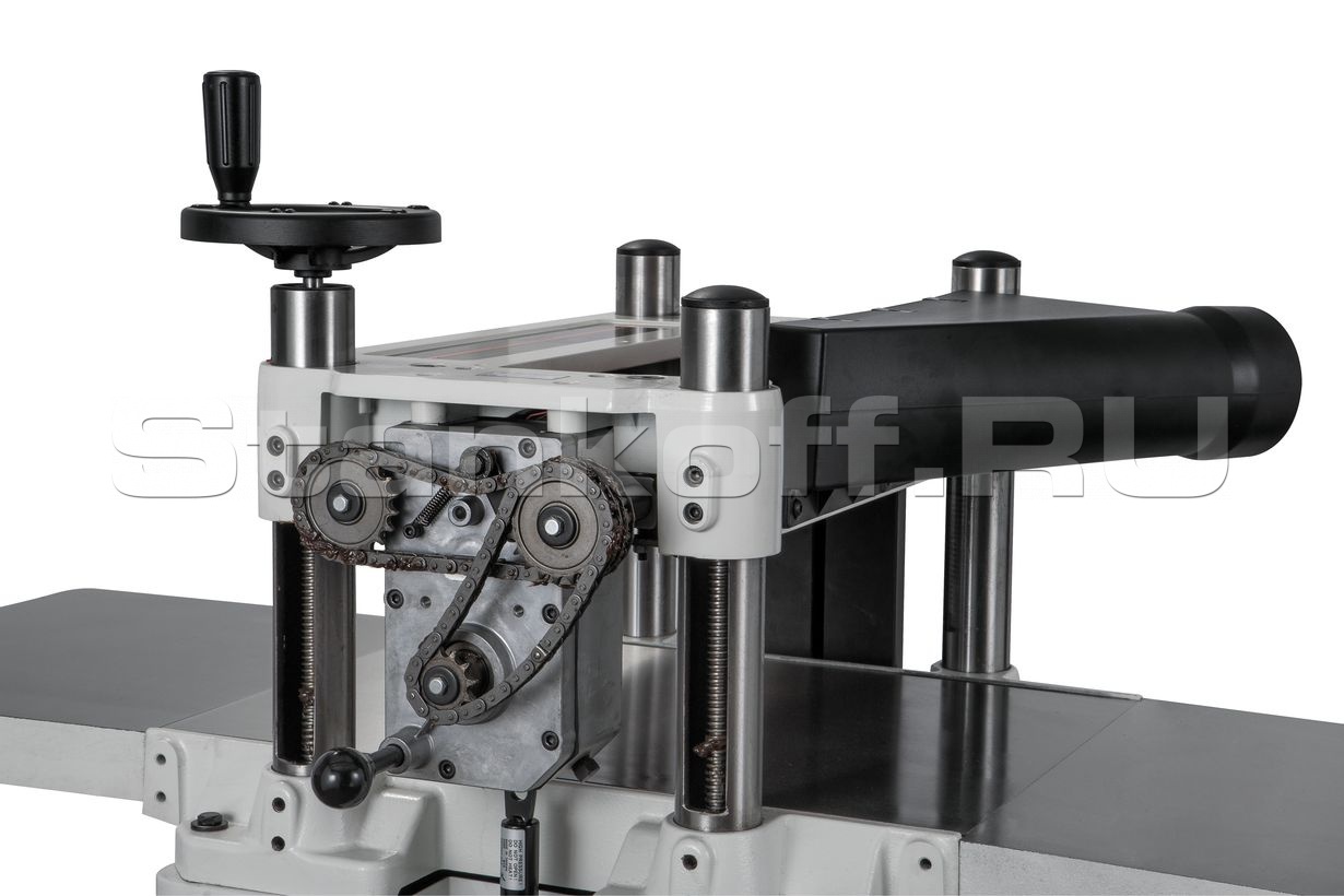Модель сочетает высокие рабочие характеристики и удобство эксплуатации. К примеру, для облегчения подъема строгальной части при регулировке установлено два газовых упора, компенсирующих вес подвижной части механизма. Лифт производится вращением штурвала, установленного в горизонтальной плоскости непосредственно на ходовом винте одной из четырех колонн. Один оборот рукоятки приводит к перемещению на 4 мм.
