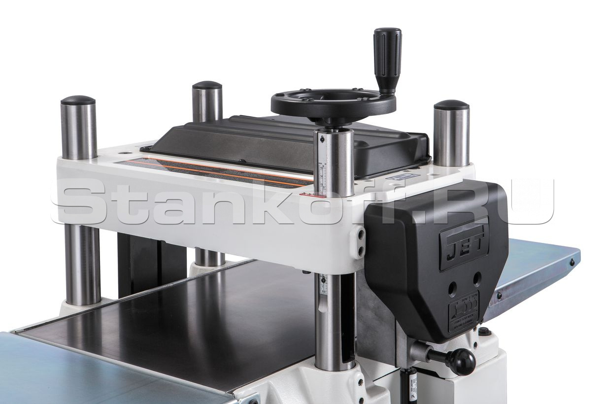 JWP-15B — профессиональный рейсмусовый станок с откидными столами, оптимальный для использования в небольших столярных мастерских, работает под напряжением 400В. Это полностью новая современная модель, сочетающая высокие рабочие характеристики и удобство эксплуатации. К примеру, для облегчения подъема строгальной части при регулировке установлено два газовых упора, компенсирующих вес подвижной части механизма (к тому же сам узел более легкий из алюминиевой, а не чугунной отливки). Лифт производится вращением штурвала, установленного в горизонтальной плоскости непосредственно на ходовом винте одной из четырех колонн. Один оборот рукоятки приводит к перемещению на 4 мм.