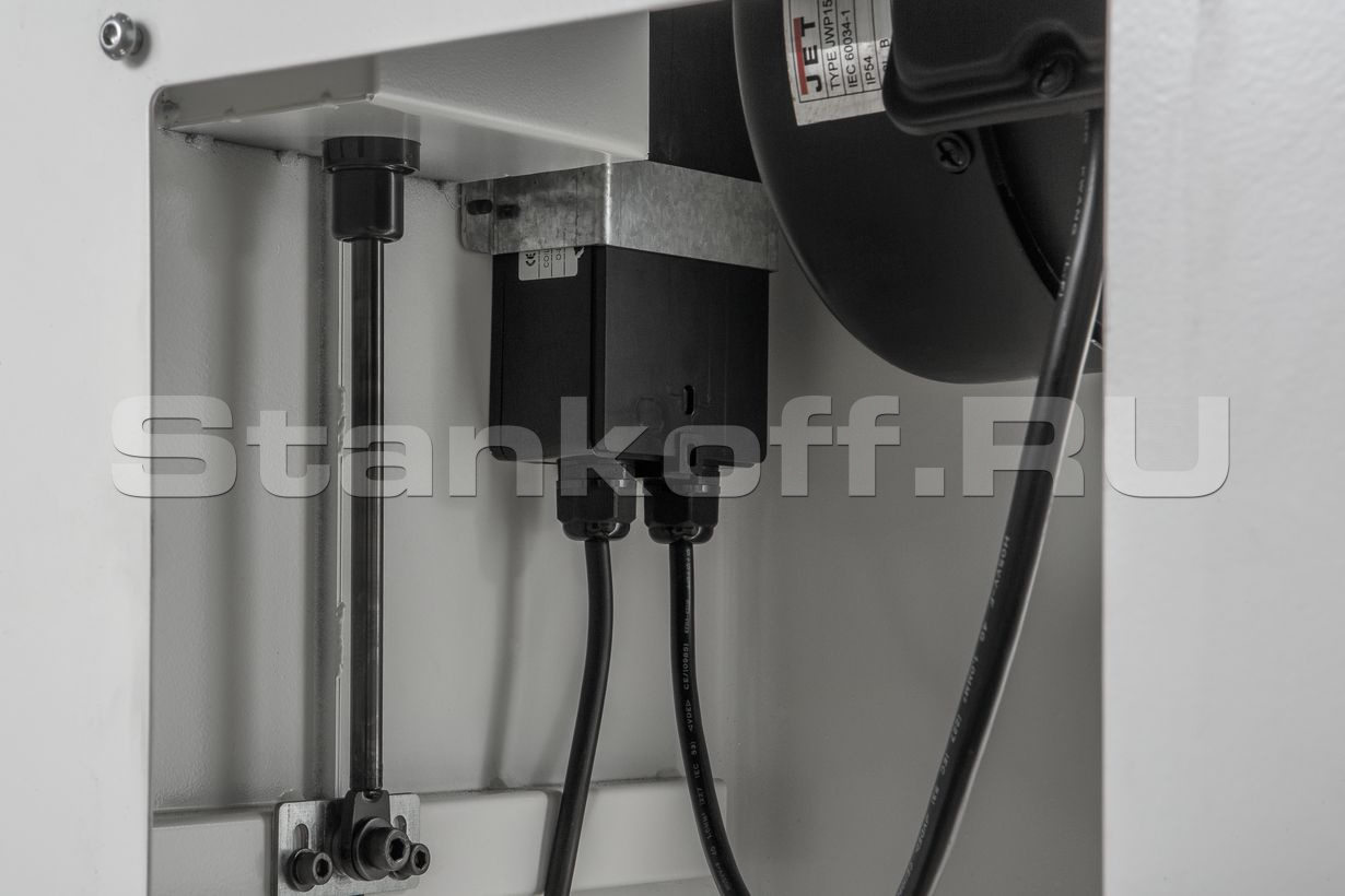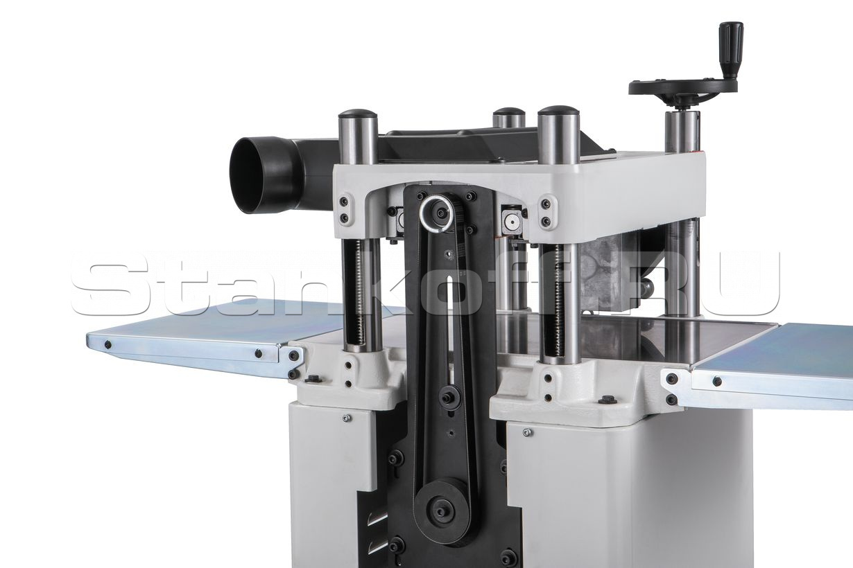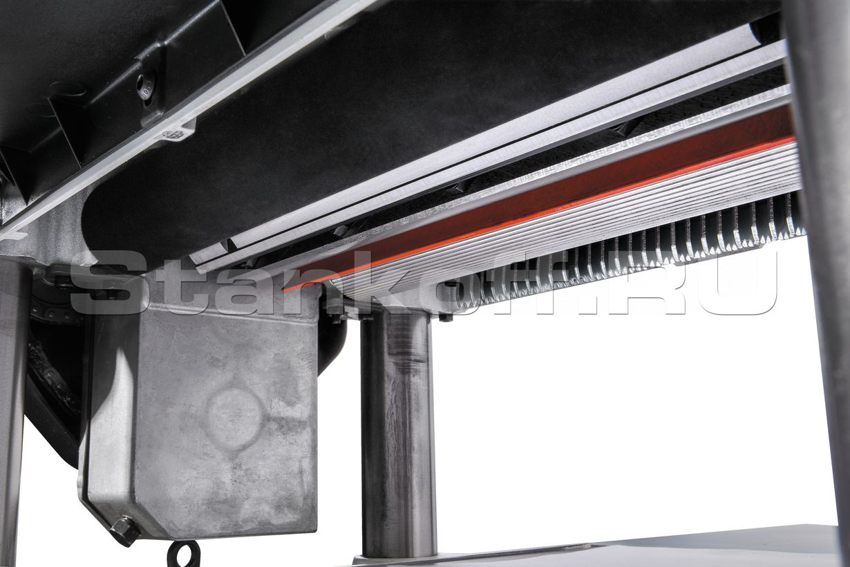 Автоматическая подача заготовки производится двумя валами: передним стальным рифленым и задним обрезиненным гладким. Две скорости переключаются механически при помощи выдвижной рукоятки. Для защиты от выброса заготовки использована когтевая защита. Привод строгального вала поликлиновым ремнем от мотора, расположенного в нижней части корпуса. За счет такой компоновки доступ к ножам максимально упрощен: для прочистки стружки, удаления смолы или замены лезвий достаточно снять кожух пылеудаления. В качестве опции вал можно заменить на сегментированный helical с твердосплавными четырехгранными ножами, установленными в несколько рядов по спирали. Это позволит повысить качество строгания и снизить затраты времени на обслуживание станка за счет большей износостойкости лезвий.