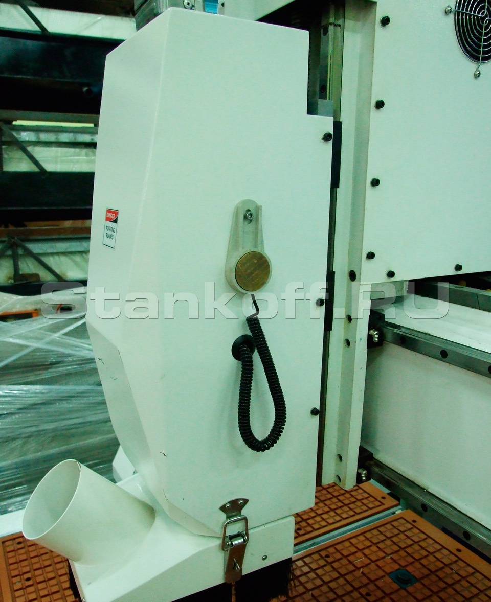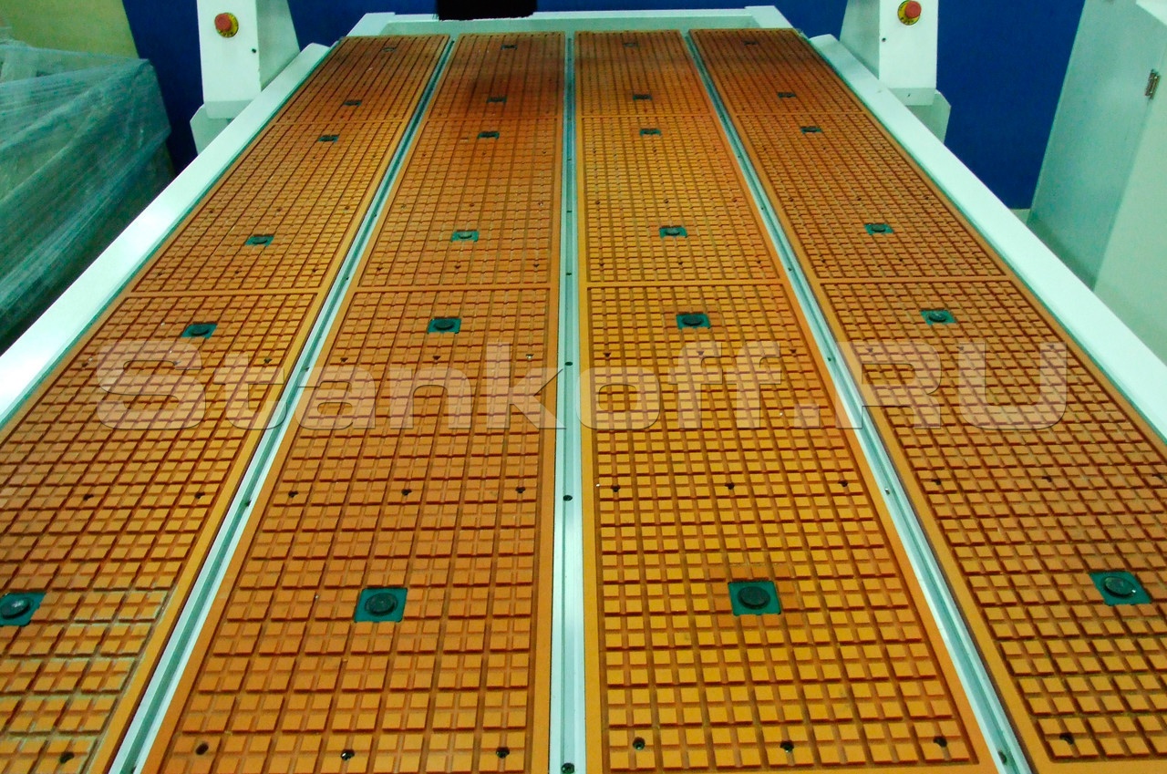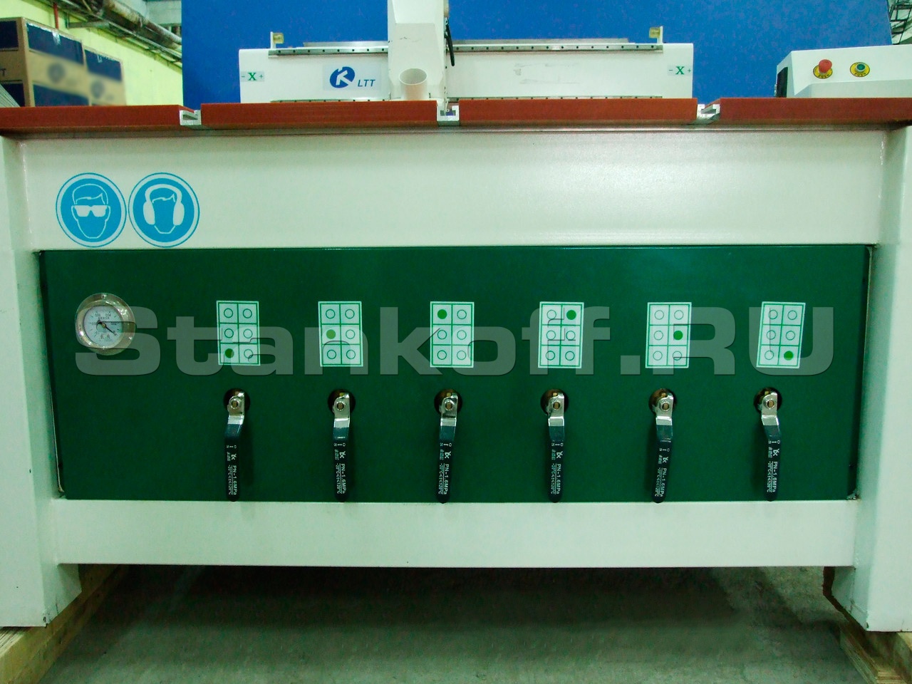 - Станок оборудован комбинированным столом позволяющим обеспечивать как вакуумную так и механическую фиксацию заготовок. Система вакуумной фиксации заготовок позволяет осуществлять быструю смену изделий и обеспечивает надежный прижим детали при обработке.