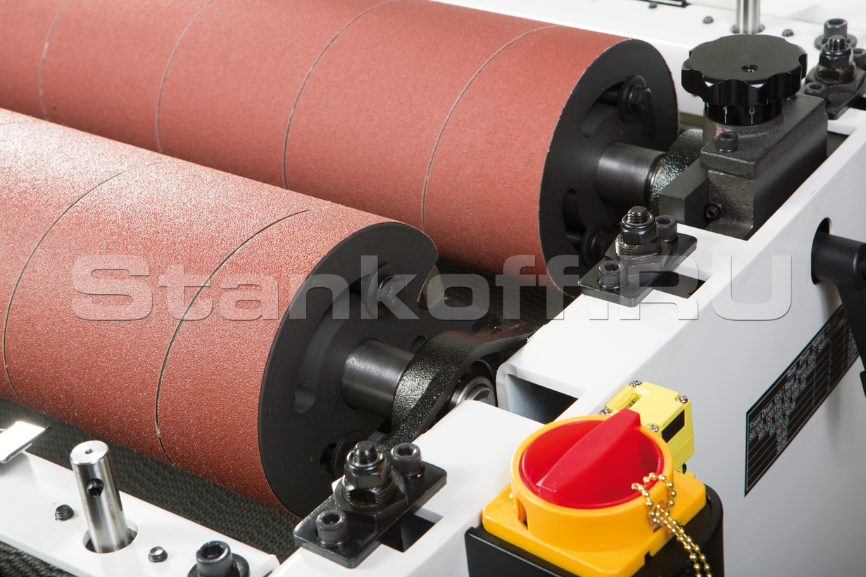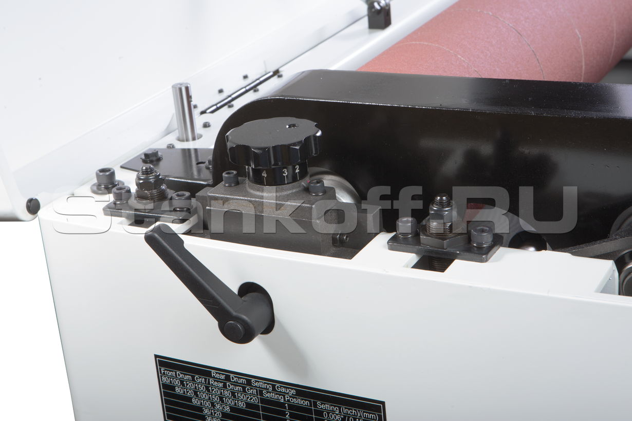 Конструкция с двумя валами позволяет использовать абразивы с разной зернистостью, то есть за один проход производить грубую и финишную шлифовку. Для достижения наилучшего результата предусмотрена точная регулировка положения выходного вала относительно приёмного, высоту которого подбирают в зависимости от зернистости абразива. Регулировка по высоте шлифовки производится независимо за счет опускания транспортёрного стола. Он размещен на четырёх опорах и регулируется с точностью до 0,2 мм по всей ширине. На практике, разброс толщины после шлифовки на хорошо настроенном DDS-237 значительно меньше. При такой точности станки способны снимать за один проход до 1,5 мм по всей ширине, необходимо лишь правильно подобрать абразив и скорость подачи (2 или 3 м/мин).