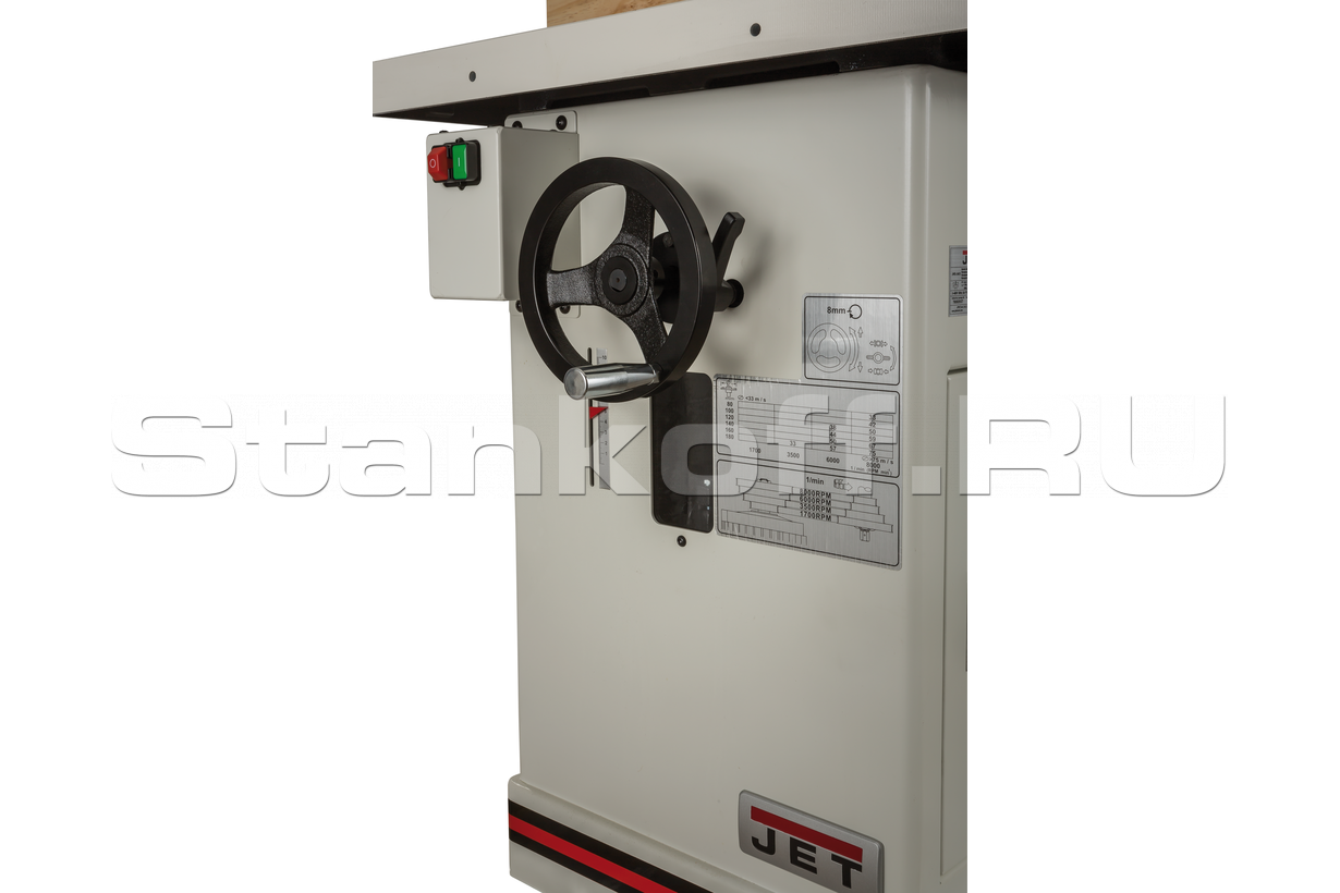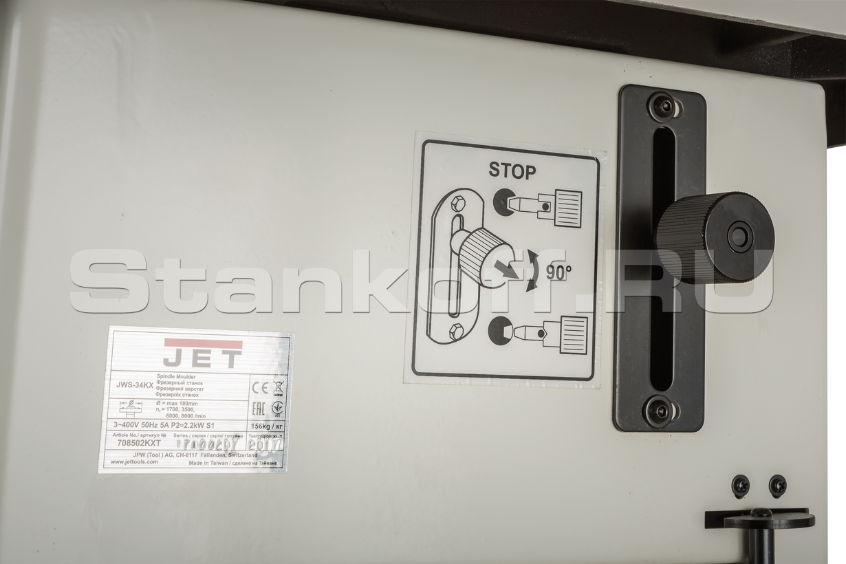Jet JWS-34KX - профессиональный фрезерный станок с мощным двигателем (особенно в 3-фазном исполнении) и массивным чугунным рабочим столом, работает под напряжением 230В. Конструкция со сменным шпинделем позволяет значительно расширить спектр решаемых задач. Входящий в комплектацию 30 мм шпиндель соответствует стандартам большинства современных производителей режущего инструмента, а 32 мм (приобретается отдельно) – отечественному. Вместо шпинделя можно установить цанговые зажимы для работы концевыми фрезами. Уникальная особенность JWS-34KX – способность выполнять некоторые шлифовальные операции: в качестве опции доступен шпиндель с набором втулок под абразивные гильзы диаметром от 25 до 100 мм, они используются в основном для доводки кантов.
