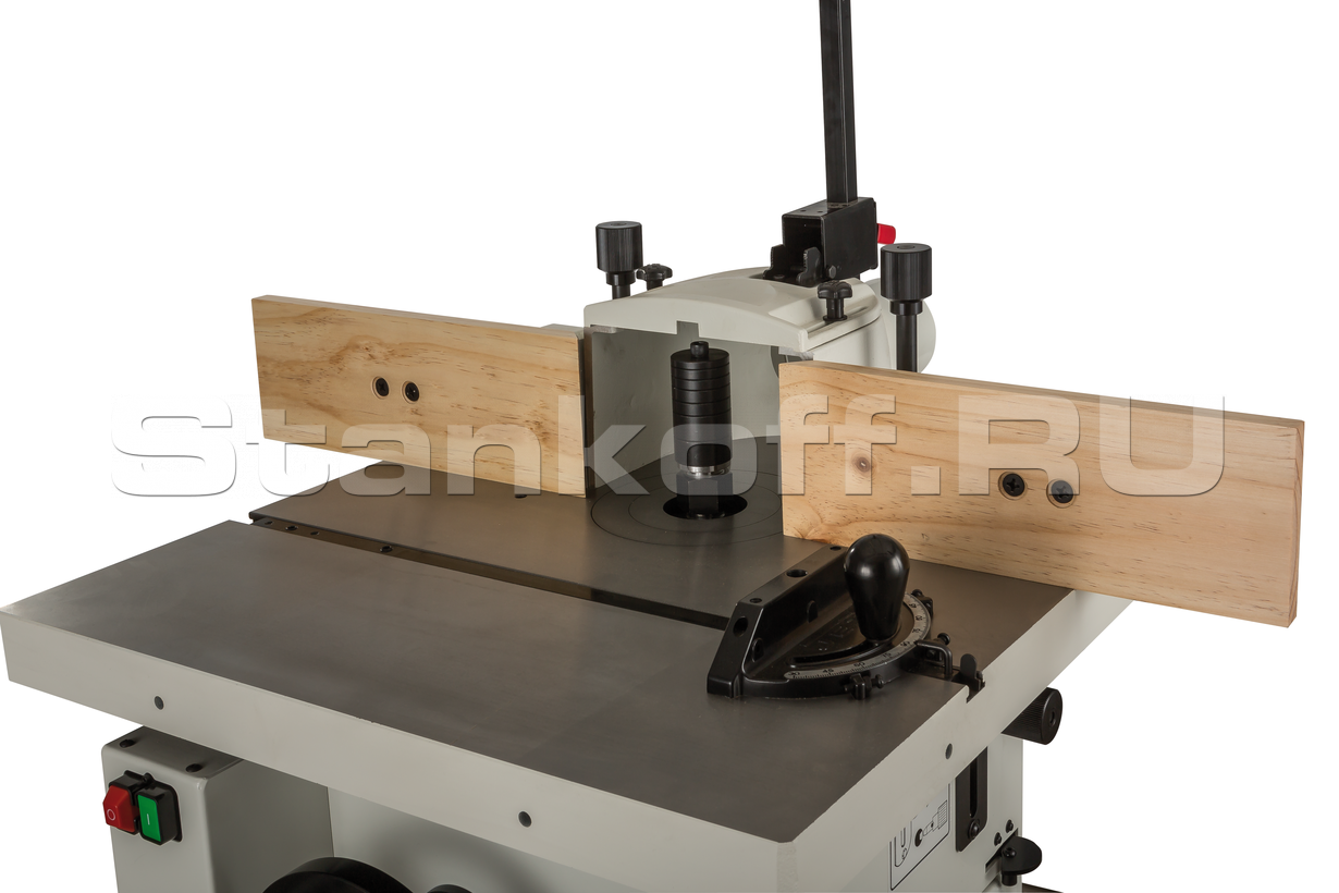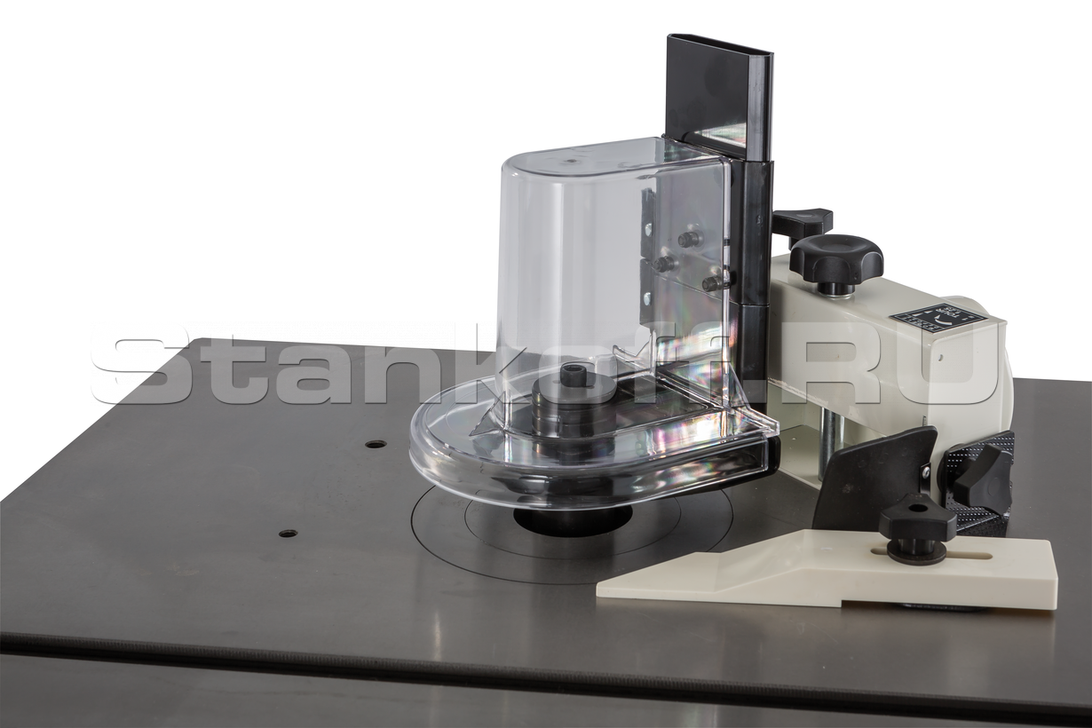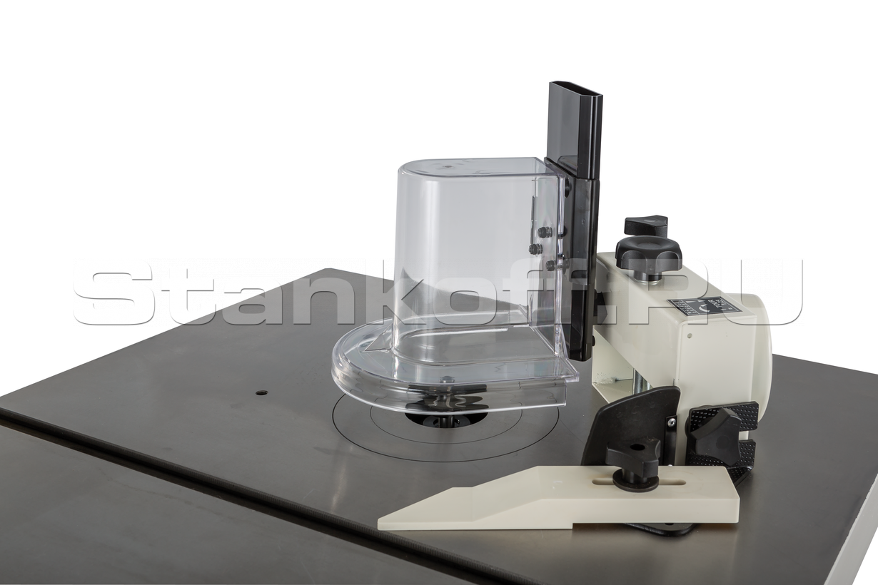 Станок оборудован точным фрезерным упором. Его массивный чугунный корпус совмещен с ограждением фрезы и 100-миллиметровым патрубком пылеотсоса. Для регулировки его перемещают целиком, а после настраивают выступ задней (принимающей) накладки при помощи точного винтового механизма с миллиметровой шкалой. Для фрезерования под углом предназначен упор с транспортирной шкалой (входит в стандартное оснащение) или небольшой подвижный чугунный стол (опция), оснащенный прижимом заготовки и транспортирным упором. Оба приспособления перемещаются вдоль Т-образного паза в рабочем столе.